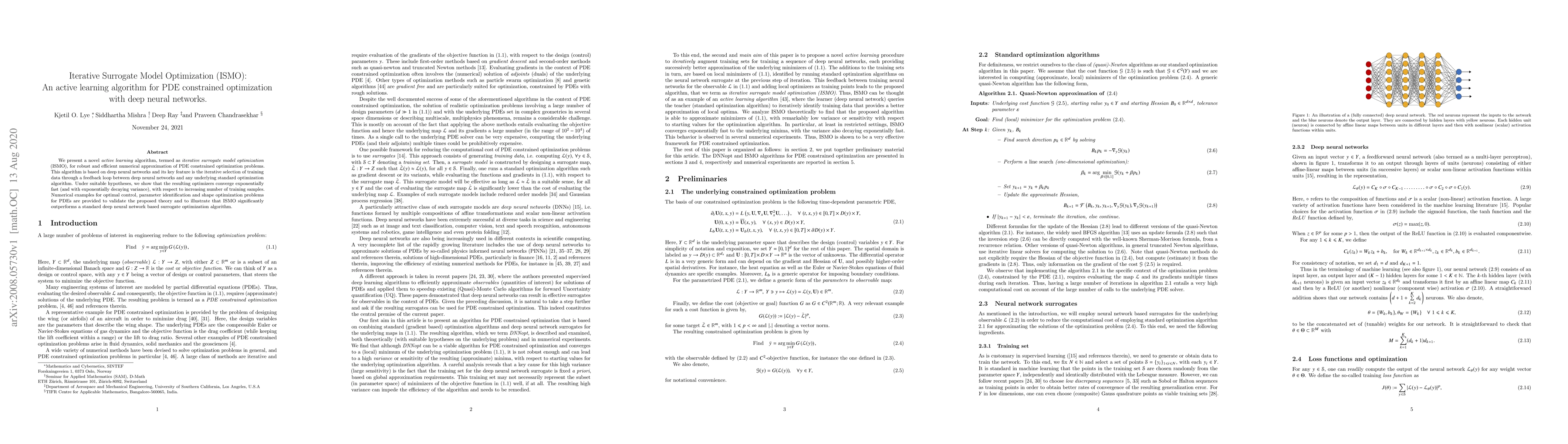 The paper introduces ISMO, an active learning algorithm for PDE constrained optimization using deep neural networks, which iteratively selects training data to enhance convergence speed. Numerical results demonstrate ISMO's superior performance over standard deep neural network surrogate optimization methods.