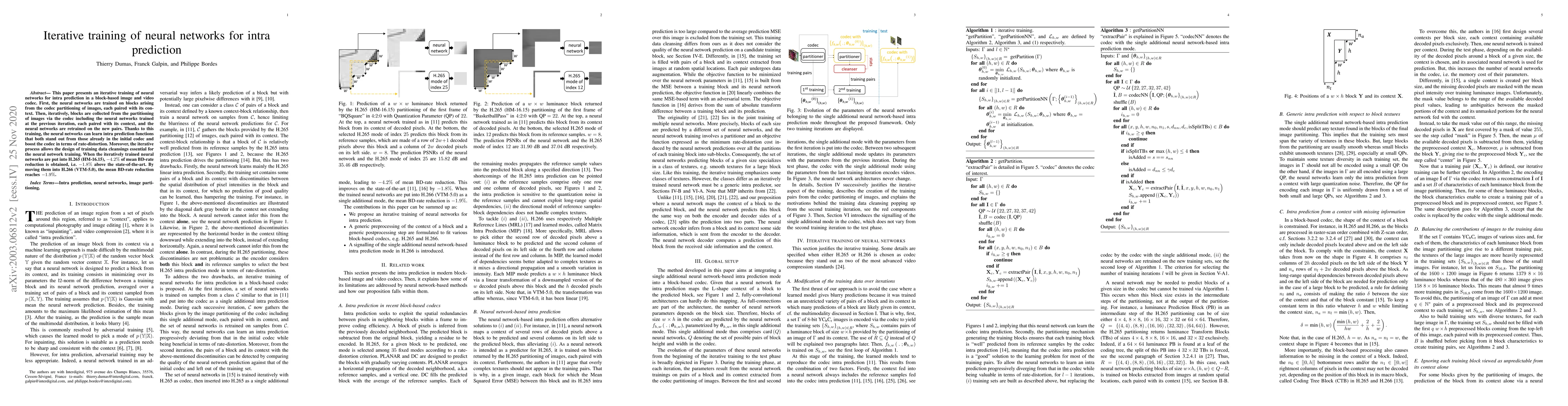 This paper presents an iterative training of neural networks for intra prediction in a block-based image and video codec. First, the neural networks are trained on blocks arising from the codec partitioning of images, each paired with its context. Then, iteratively, blocks are collected from the partitioning of images via the codec including the neural networks trained at the previous iteration, each paired with its context, and the neural networks are retrained on the new pairs. Thanks to this training, the neural networks can learn intra prediction functions that both stand out from those already in the initial codec and boost the codec in terms of rate-distortion. Moreover, the iterative process allows the design of training data cleansings essential for the neural network training. When the iteratively trained neural networks are put into H.265 (HM-16.15), -4.2% of mean dB-rate reduction is obtained. By moving them into H.266 (VTM-5.0), the mean dB-rate reduction reaches -1.9%.