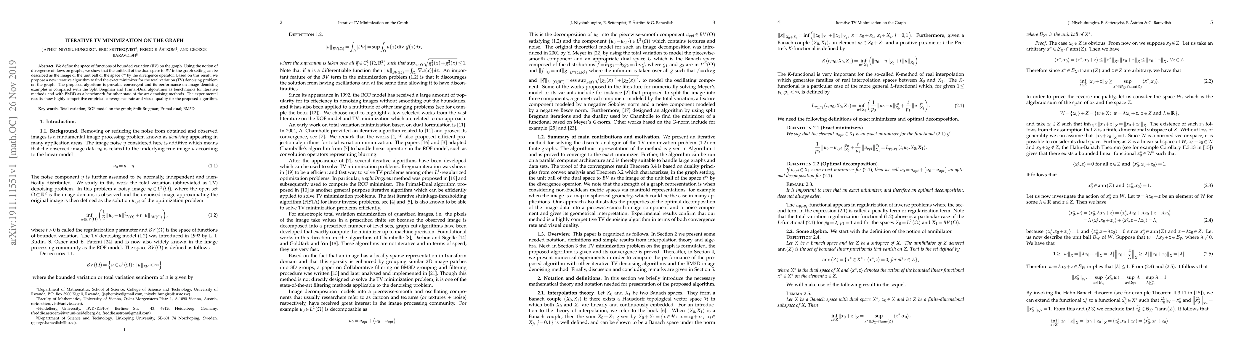 This research defines functions of bounded variation on graphs, linking the unit ball of the dual space to $ell^{infty}$ via divergence of flows. It proposes a novel, provably convergent iterative algorithm for total variation denoising on graphs, demonstrating competitive performance against benchmarks like Split Bregman, Primal-Dual, and BM3D methods.