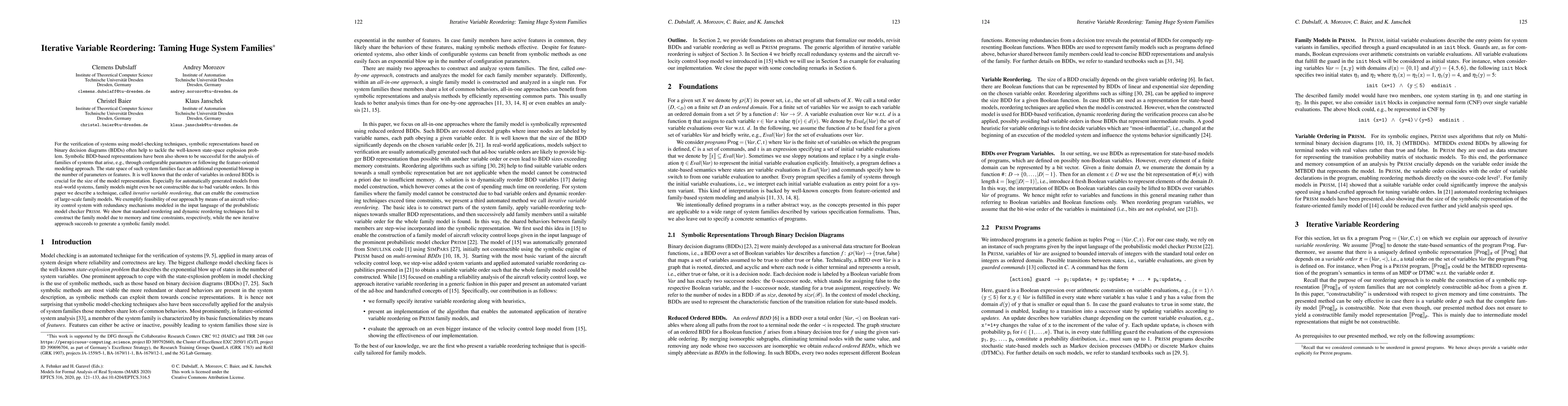 For the verification of systems using model-checking techniques, symbolic representations based on binary decision diagrams (BDDs) often help to tackle the well-known state-space explosion problem. Symbolic BDD-based representations have been also shown to be successful for the analysis of families of systems that arise, e.g., through configurable parameters or following the feature-oriented modeling approach. The state space of such system families face an additional exponential blowup in the number of parameters or features. It is well known that the order of variables in ordered BDDs is crucial for the size of the model representation. Especially for automatically generated models from real-world systems, family models might even be not constructible due to bad variable orders. In this paper we describe a technique, called iterative variable reordering, that can enable the construction of large-scale family models. We exemplify feasibility of our approach by means of an aircraft velocity control system with redundancy mechanisms modeled in the input language of the probabilistic model checker PRISM. We show that standard reordering and dynamic reordering techniques fail to construct the family model due to memory and time constraints, respectively, while the new iterative approach succeeds to generate a symbolic family model.