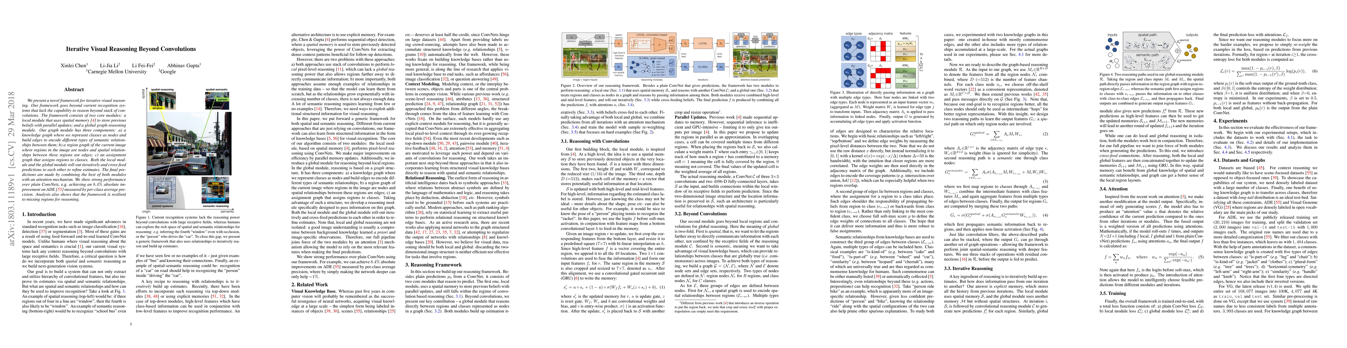 We present a novel framework for iterative visual reasoning. Our framework goes beyond current recognition systems that lack the capability to reason beyond stack of convolutions. The framework consists of two core modules: a local module that uses spatial memory to store previous beliefs with parallel updates; and a global graph-reasoning module. Our graph module has three components: a) a knowledge graph where we represent classes as nodes and build edges to encode different types of semantic relationships between them; b) a region graph of the current image where regions in the image are nodes and spatial relationships between these regions are edges; c) an assignment graph that assigns regions to classes. Both the local module and the global module roll-out iteratively and cross-feed predictions to each other to refine estimates. The final predictions are made by combining the best of both modules with an attention mechanism. We show strong performance over plain ConvNets, \eg achieving an $8.4\%$ absolute improvement on ADE measured by per-class average precision. Analysis also shows that the framework is resilient to missing regions for reasoning.