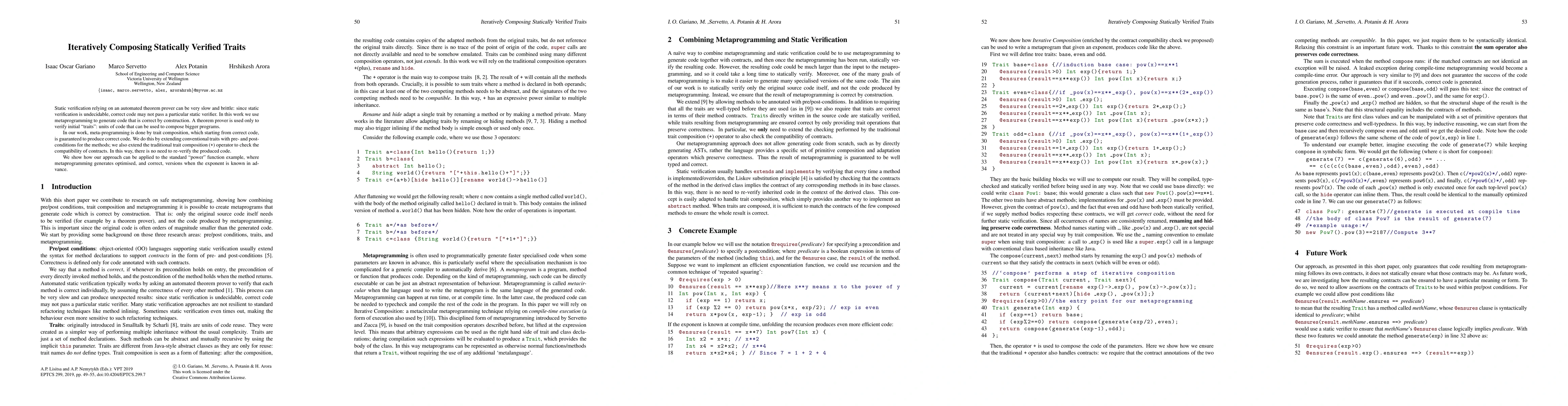 This paper proposes a method for iteratively composing statically verified traits using metaprogramming to generate code that is correct by construction. The approach extends traits with pre- and post-conditions and uses a theorem prover only to verify initial traits, ensuring that composed code remains correct without needing re-verification.