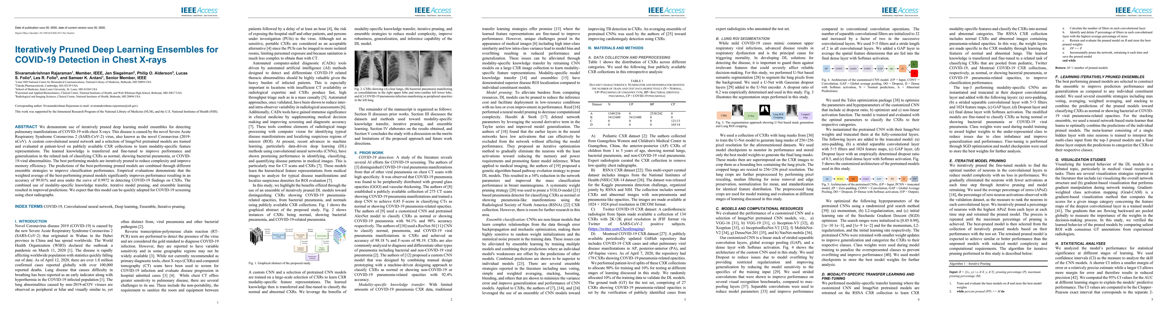 We demonstrate use of iteratively pruned deep learning model ensembles for detecting pulmonary manifestation of COVID-19 with chest X-rays. This disease is caused by the novel Severe Acute Respiratory Syndrome Coronavirus 2 (SARS-CoV-2) virus, also known as the novel Coronavirus (2019-nCoV). A custom convolutional neural network and a selection of ImageNet pretrained models are trained and evaluated at patient-level on publicly available CXR collections to learn modality-specific feature representations. The learned knowledge is transferred and fine-tuned to improve performance and generalization in the related task of classifying CXRs as normal, showing bacterial pneumonia, or COVID-19-viral abnormalities. The best performing models are iteratively pruned to reduce complexity and improve memory efficiency. The predictions of the best-performing pruned models are combined through different ensemble strategies to improve classification performance. Empirical evaluations demonstrate that the weighted average of the best-performing pruned models significantly improves performance resulting in an accuracy of 99.01% and area under the curve of 0.9972 in detecting COVID-19 findings on CXRs. The combined use of modality-specific knowledge transfer, iterative model pruning, and ensemble learning resulted in improved predictions. We expect that this model can be quickly adopted for COVID-19 screening using chest radiographs.