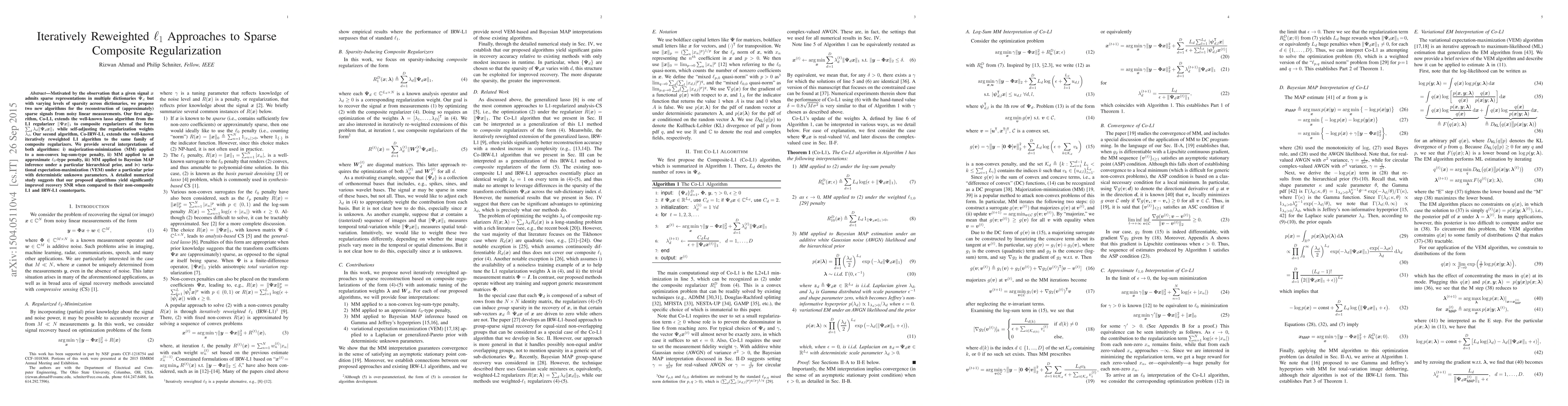 This paper proposes two new algorithms, Co-L1 and Co-IRW-L1, for reconstructing sparse signals from noisy measurements using composite regularization. Both algorithms iteratively adjust regularization weights to handle varying sparsity levels across multiple dictionaries, demonstrating improved signal recovery performance over traditional L1 and IRW-L1 methods.