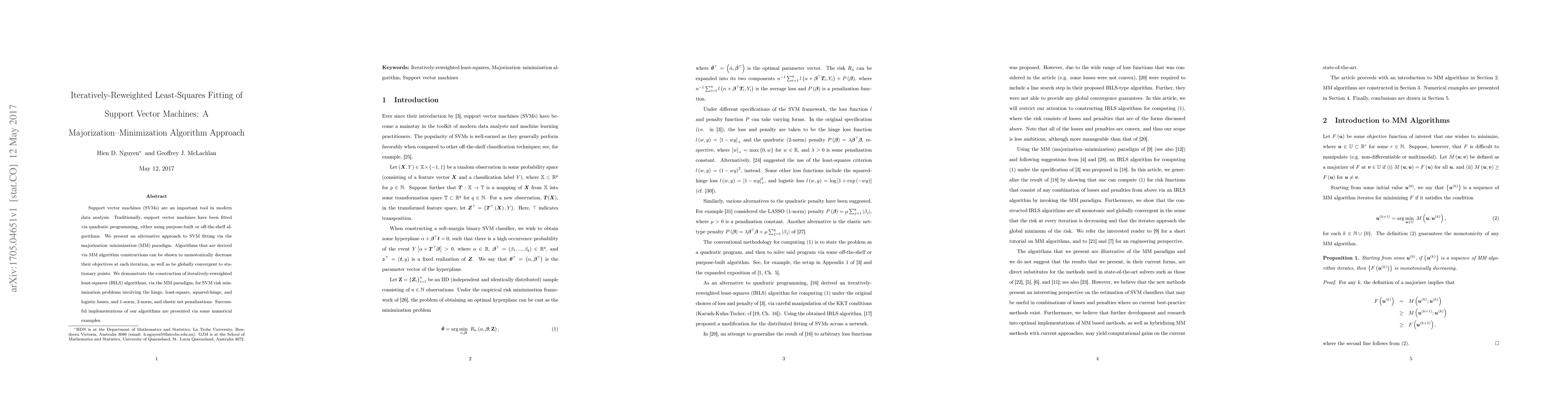 This paper introduces an alternative fitting method for support vector machines (SVMs) using iteratively-reweighted least-squares (IRLS) within a majorization-minimization (MM) framework, showing monotonic objective decreases and global convergence, and applies this approach to various SVM risk minimization problems. Numerical examples demonstrate successful implementations.