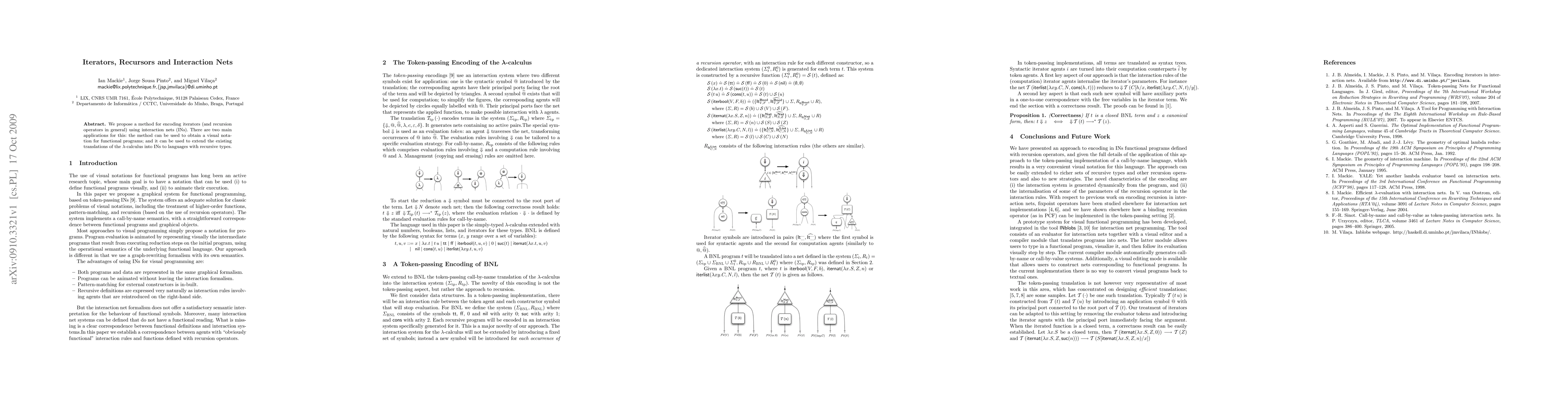 Researchers propose a method to encode iterators and recursion operators using interaction nets, enabling visual notation for functional programs and extending lambda-calculus translations.