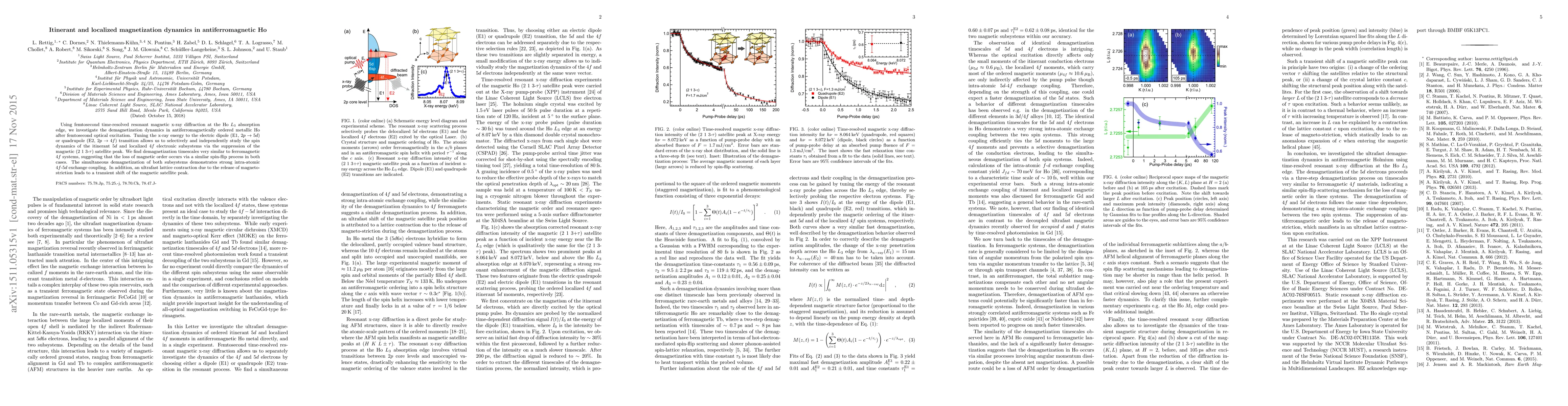 This study uses femtosecond time-resolved resonant magnetic x-ray diffraction to investigate the demagnetization dynamics in antiferromagnetic Ho, revealing similar demagnetization timescales in both itinerant 5d and localized 4f subsystems. The findings suggest strong intra-atomic exchange coupling and an ultrafast lattice contraction due to magnetostriction release.