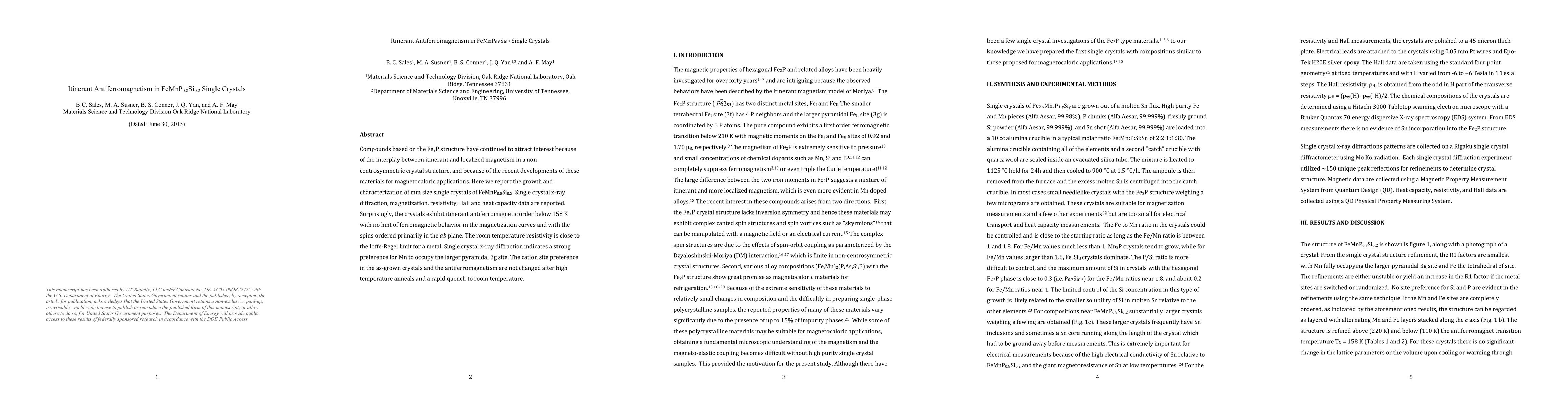 This study investigates FeMnP0.8Si0.2 single crystals, revealing itinerant antiferromagnetic order below 158 K without ferromagnetic behavior, with spins primarily ordered in the ab plane. The material's resistivity near the Ioffe-Regel limit and Mn preference for the 3g site remain stable through high-temperature treatments.