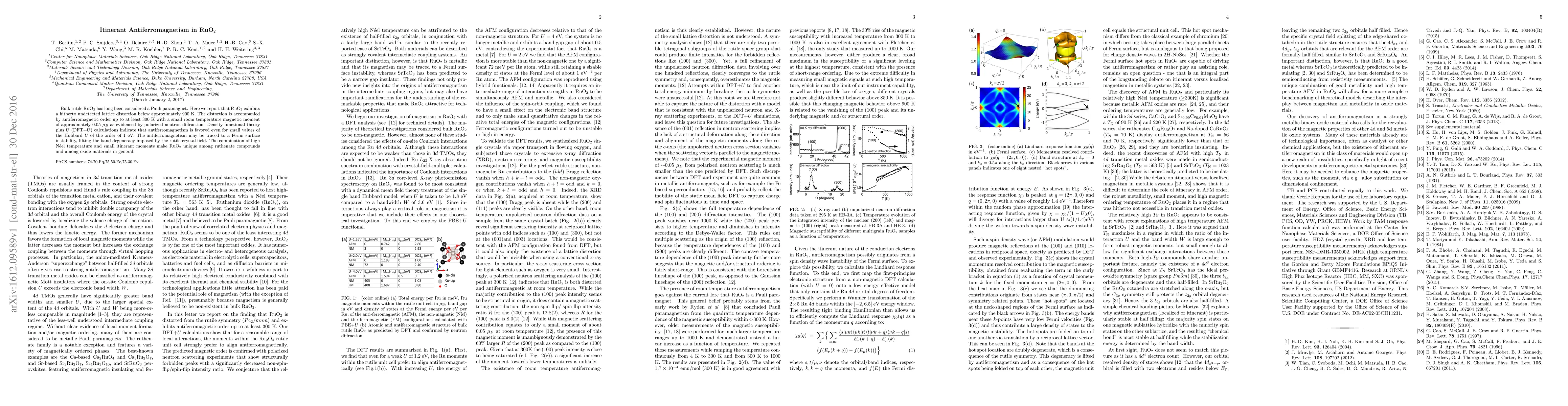 RuO$_2$ exhibits a previously undetected lattice distortion and antiferromagnetic order below 900 K, with a small magnetic moment at room temperature. Density functional theory calculations suggest that antiferromagnetism arises from a Fermi surface instability, making RuO$_2$ unique among oxide materials.