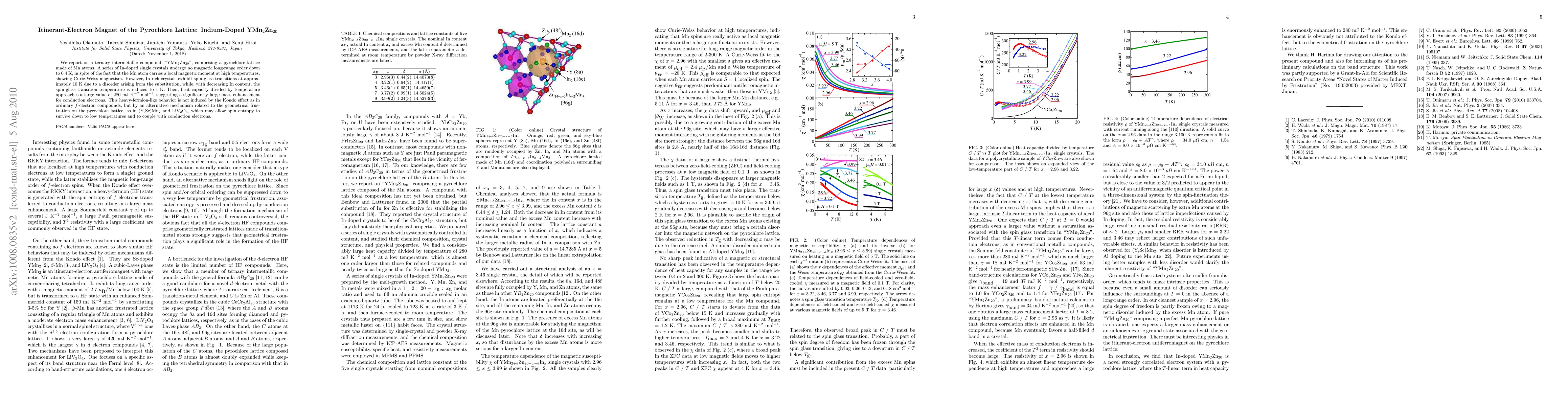 We report on a ternary intermetallic compound, "YMn2Zn20", comprising a pyrochlore lattice made of Mn atoms. A series of In-doped single crystals undergo no magnetic long-range order down to 0.4 K, in spite of the fact that the Mn atom carries a local magnetic moment at high temperatures, showing Curie-Weiss magnetism. However, In-rich crystals exhibit spin-glass transitions at approximately 10 K due to a disorder arising from the substitution, while, with decreasing In content, the spin-glass transition temperature is reduced to 1 K. Then, heat capacity divided by temperature approaches a large value of 280 mJ K-2 mol-1, suggesting a significantly large mass enhancement for conduction electrons. This heavy-fermion-like behavior is not induced by the Kondo effect as in ordinary f-electron compounds, but by an alternative mechanism related to the geometrical frustration on the pyrochlore lattice, as in (Y,Sc)Mn2 and LiV2O4, which may allow spin entropy to survive down to low temperatures and to couple with conduction electrons.