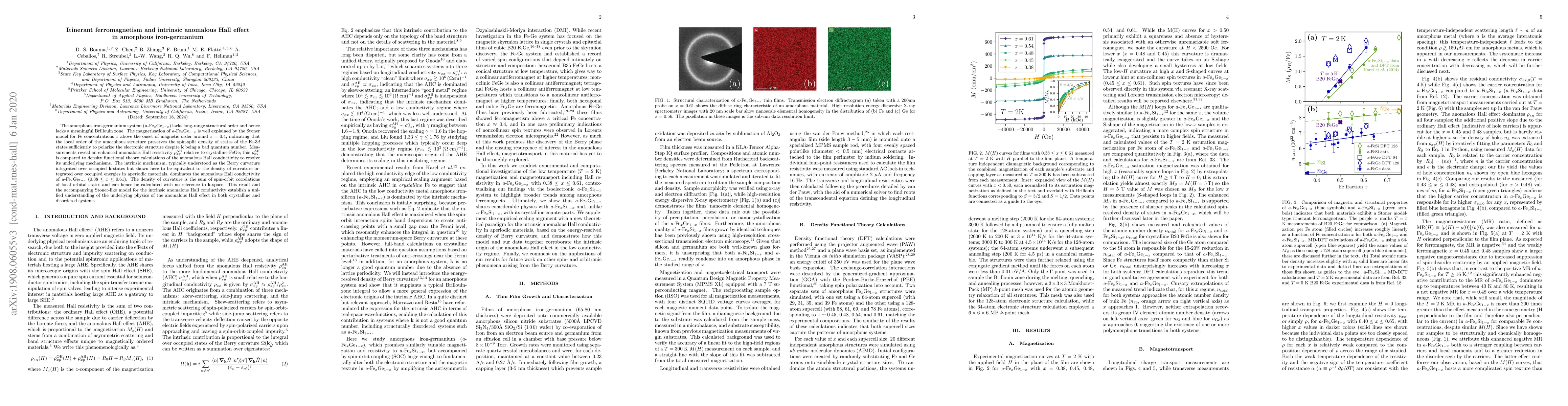 The amorphous iron-germanium system ($a$-Fe$_x$Ge$_{1-x}$) lacks long-range structural order and hence lacks a meaningful Brillouin zone. The magnetization of \aFeGe is well explained by the Stoner model for Fe concentrations $x$ above the onset of magnetic order around $x=0.4$, indicating that the local order of the amorphous structure preserves the spin-split density of states of the Fe-$3d$ states sufficiently to polarize the electronic structure despite $\mathbf{k}$ being a bad quantum number. Measurements reveal an enhanced anomalous Hall resistivity $\rho_{xy}^{\mathrm{AH}}$ relative to crystalline FeGe; this $\rho_{xy}^{\mathrm{AH}}$ is compared to density functional theory calculations of the anomalous Hall conductivity to resolve its underlying mechanisms. The intrinsic mechanism, typically understood as the Berry curvature integrated over occupied $\mathbf{k}$-states but shown here to be equivalent to the density of curvature integrated over occupied energies in aperiodic materials, dominates the anomalous Hall conductivity of $a$-Fe$_x$Ge$_{1-x}$ ($0.38 \leq x \leq 0.61$). The density of curvature is the sum of spin-orbit correlations of local orbital states and can hence be calculated with no reference to $\mathbf{k}$-space. This result and the accompanying Stoner-like model for the intrinsic anomalous Hall conductivity establish a unified understanding of the underlying physics of the anomalous Hall effect in both crystalline and disordered systems.