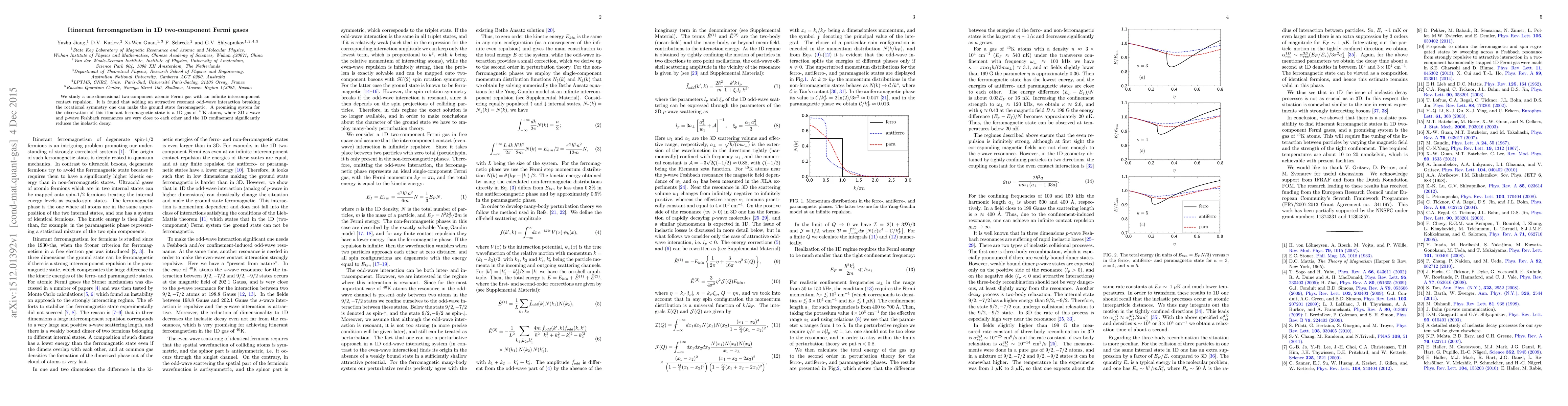 Researchers discovered that adding a specific interaction to a 1D two-component Fermi gas can create an itinerant ferromagnetic state. This finding has implications for the observation of such states in systems like $^{40}$K atoms.