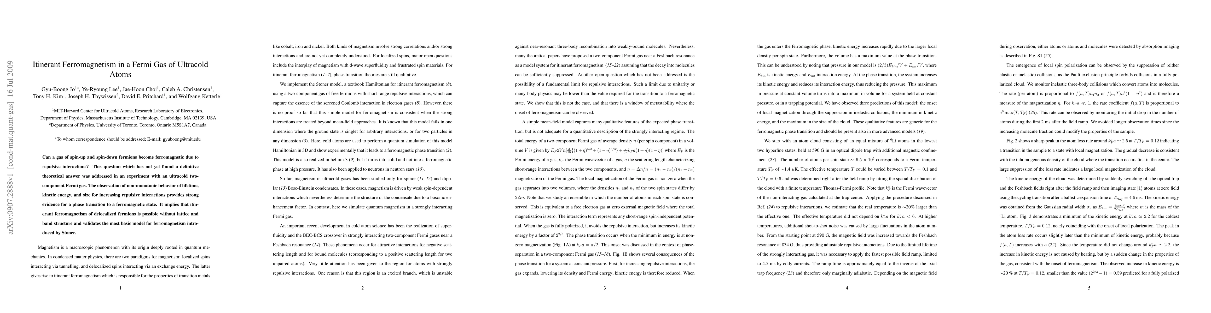 This research experimentally investigates whether ultracold Fermi gases can exhibit itinerant ferromagnetism through repulsive interactions, finding evidence for a phase transition to a ferromagnetic state and validating Stoner's basic model of ferromagnetism.