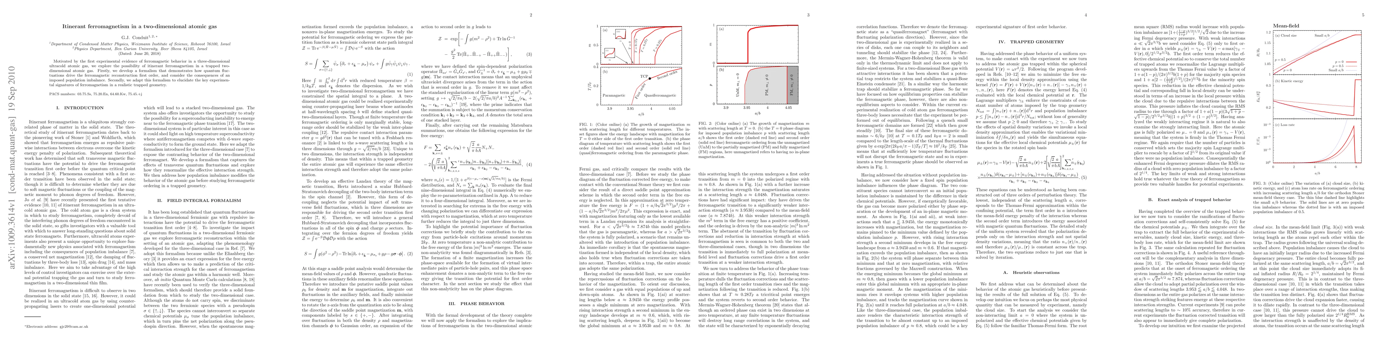 This paper investigates itinerant ferromagnetism in a two-dimensional ultracold atomic gas, developing a formalism to show how quantum fluctuations induce a first-order ferromagnetic phase transition and examining the effects of population imbalance. It also adapts this framework to identify experimental signatures relevant to trapped geometries.