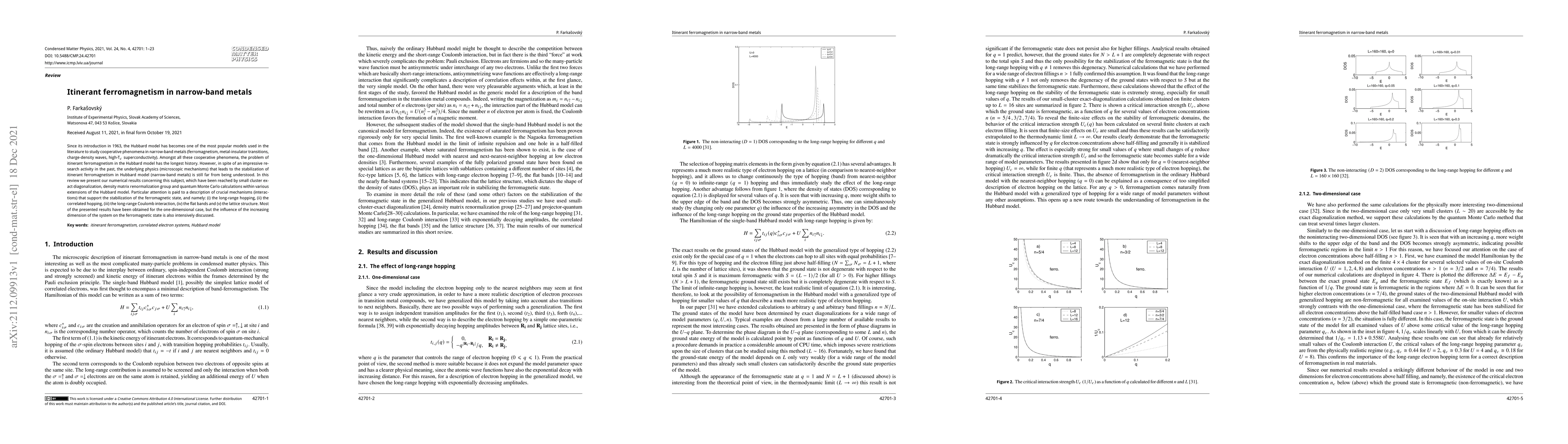 This paper reviews the study of itinerant ferromagnetism in narrow-band metals using various numerical methods, revealing key mechanisms such as long-range hopping and correlated hopping that support its stabilization.