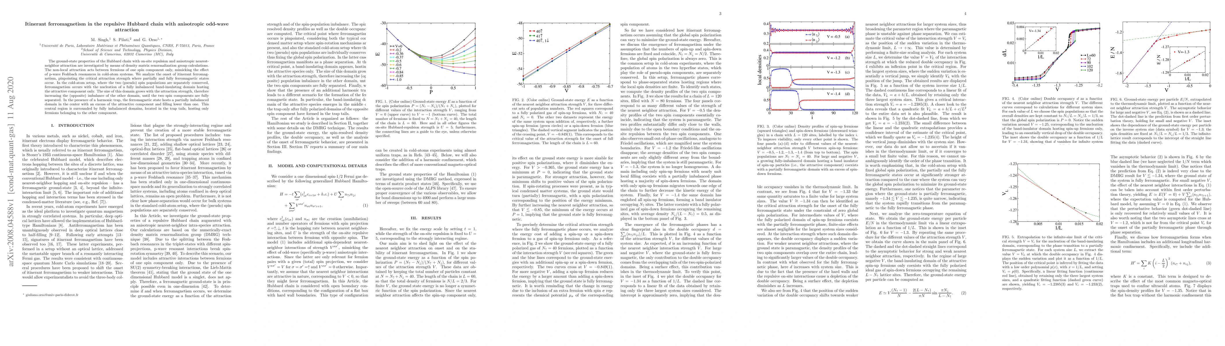 The ground-state properties of the Hubbard chain with on-site repulsion and anisotropic nearest-neighbor attraction are investigated by means of density matrix renormalization group calculations. The non-local attraction acts between fermions of one spin component only, mimicking the effect of p-wave Feshbach resonances in cold-atom systems. We analyze the onset of itinerant ferromagnetism, pinpointing the critical attraction strength where partially and fully ferromagnetic states occur. In the cold-atom setup, where the two (pseudo) spin populations are separately conserved, ferromagnetism occurs with the nucleation of a fully imbalanced band-insulating domain hosting the attractive component only. The size of this domain grows with the attraction strength, therefore increasing the (opposite) imbalance of the other domain, until the two spin components are fully separated. In the presence of a harmonic trap, the ferromagnetic state hosts a partially imbalanced domain in the center with an excess of the attractive component and filling lower than one. This central region is surrounded by fully imbalanced domains, located in the trap tails, hosting only fermions belonging to the other component.
