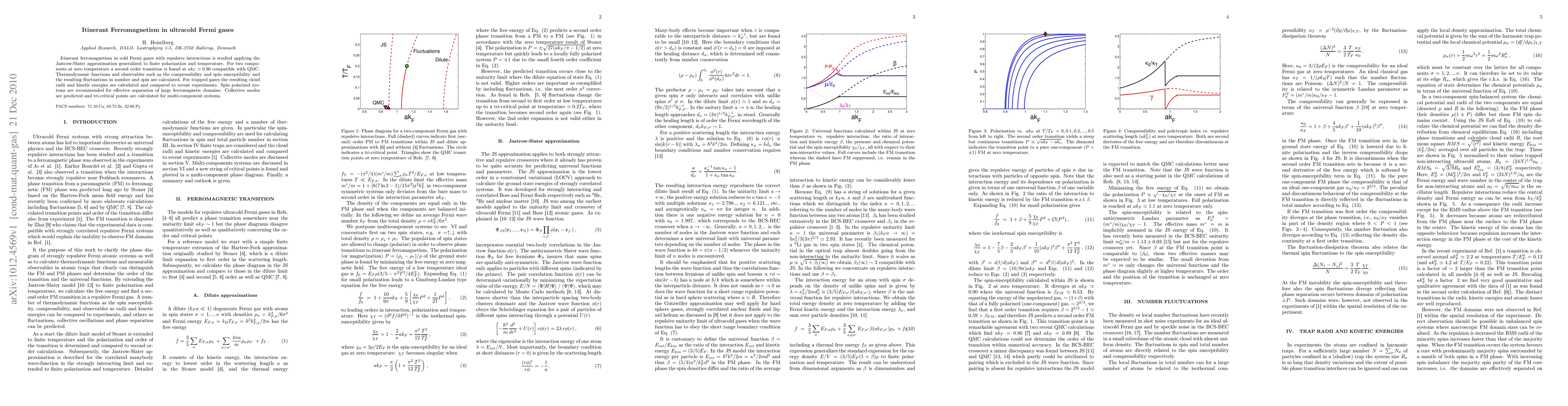 This paper investigates itinerant ferromagnetism in ultracold Fermi gases using a generalized Jastrow-Slater approximation, revealing a second-order transition at $ak_F\simeq0.90$ and predicting collective modes and tri-critical points, with implications for the separation of ferromagnetic domains and agreement with quantum Monte Carlo simulations.