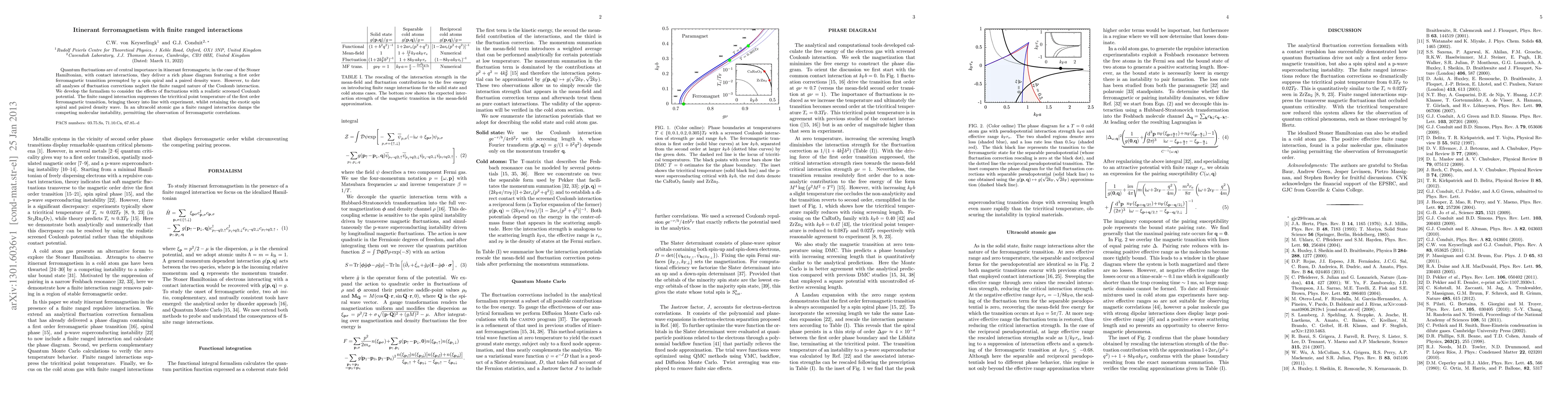 This paper develops a formalism to incorporate the effects of finite ranged Coulomb interactions in itinerant ferromagnets, showing that these interactions suppress the tricritical point temperature, aligning theoretical predictions with experimental observations. It also discusses the implications for ultracold atomic gases, where such interactions can stabilize ferromagnetic correlations.