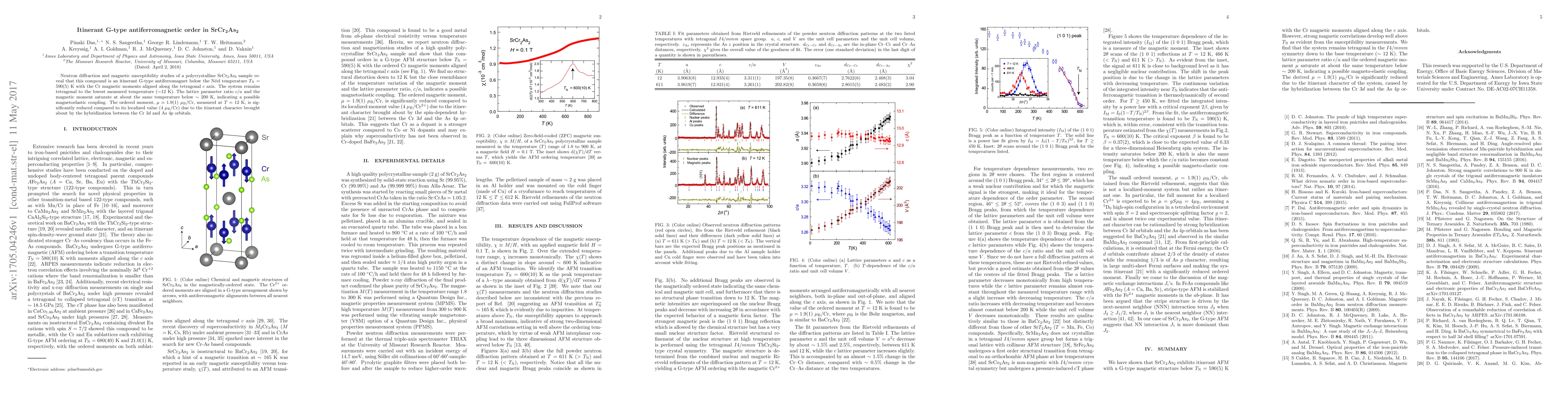 SrCr$_2$As$_2$ exhibits itinerant G-type antiferromagnetic order below $T_{\textrm N}$ = 590(5) K, with Cr moments aligned along the $c$ axis, maintaining tetragonal symmetry down to 12 K. The reduced ordered moment due to Cr-As orbital hybridization indicates significant itinerant character.