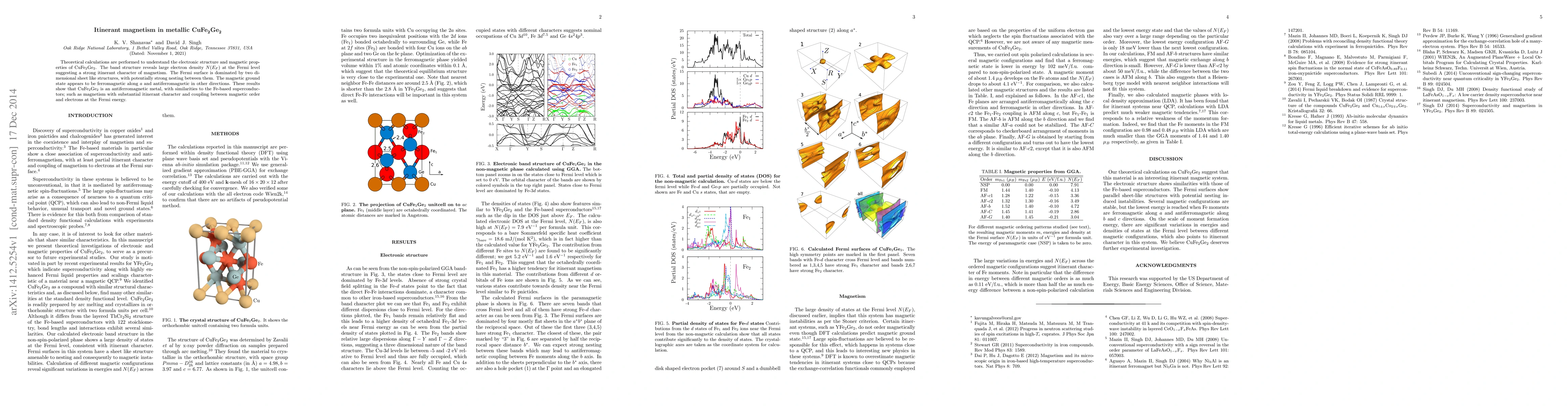 This study reveals that CuFe$_2$Ge$_2$ exhibits strong itinerant magnetism with a ferromagnetic ground state along the $a$ direction and antiferromagnetic in others, supported by large electron density at the Fermi level and Fermi surface nesting. The compound displays antiferromagnetic metallic properties akin to Fe-based superconductors.