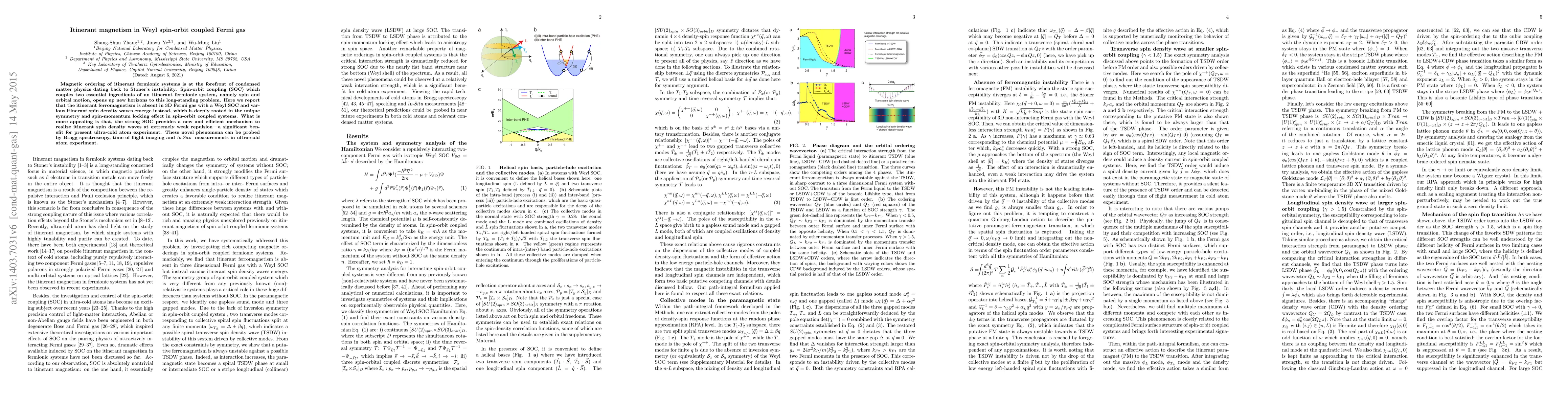 This paper investigates the magnetic ordering in a 3D Fermi gas with Weyl spin-orbit coupling, finding that itinerant ferromagnetism is absent and instead various itinerant spin density waves emerge due to unique symmetry and spin-momentum locking effects. These findings offer a new mechanism for realizing spin density waves at weak repulsion, beneficial for ultra-cold atom experiments.