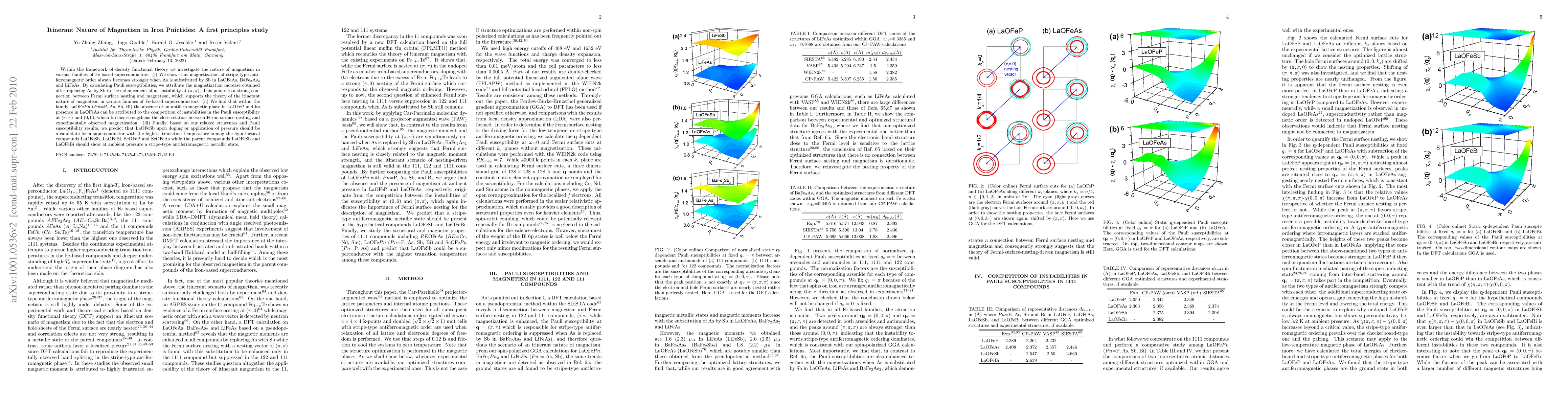 Within the framework of density functional theory we investigate the nature of magnetism in various families of Fe-based superconductors. (i) We show that magnetization of stripe-type antiferromagnetic order always becomes stronger when As is substituted by Sb in LaOFeAs, BaFe$_2$As$_2$ and LiFeAs. By calculating Pauli susceptibilities, we attribute the magnetization increase obtained after replacing As by Sb to the enhancement of an instability at $(\pi,\pi)$. This points to a strong connection between Fermi surface nesting and magnetism, which supports the theory of the itinerant nature of magnetism in various families of Fe-based superconductors. (ii) We find that within the family LaOFe$Pn$ ($Pn$=P, As, Sb, Bi) the absence of an antiferromagnetic phase in LaOFeP and its presence in LaOFeAs can be attributed to the competition of instabilities in the Pauli susceptibility at $(\pi,\pi)$ and $(0,0)$, which further strengthens the close relation between Fermi surface nesting and experimentally observed magnetization. (iii) Finally, based on our relaxed structures and Pauli susceptibility results, we predict that LaOFeSb upon doping or application of pressure should be a candidate for a superconductor with the highest transition temperature among the hypothetical compounds LaOFeSb, LaOFeBi, ScOFeP and ScOFeAs while the parent compounds LaOFeSb and LaOFeBi should show at ambient pressure a stripe-type antiferromagnetic metallic state.