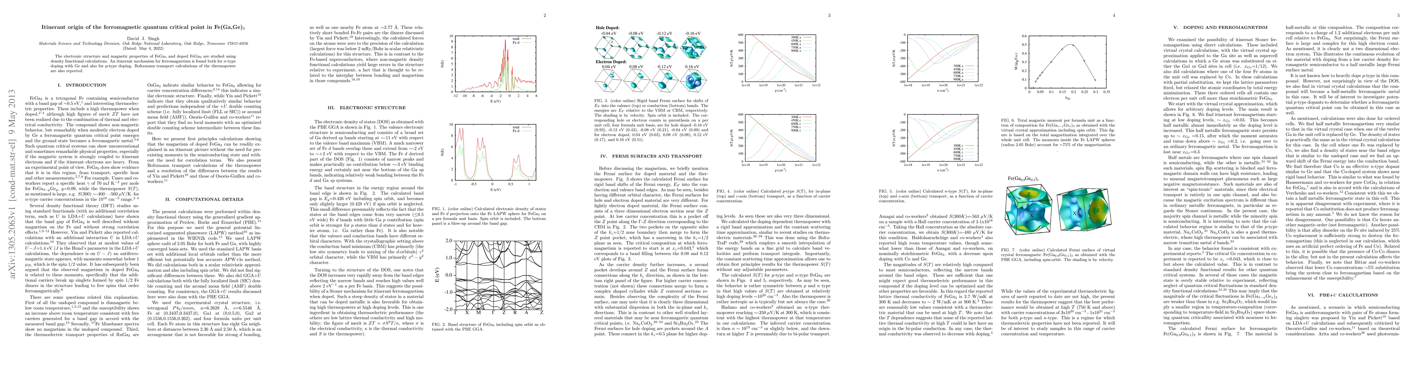 The electronic structure and magnetic properties of FeGa3 and doped FeGa3 are studied using density functional calculations. An itinerant mechanism for ferromagnetism is found both for n-type doping with Ge and also for p-type doping. Boltzmann transport calculations of the thermopower are also reported.