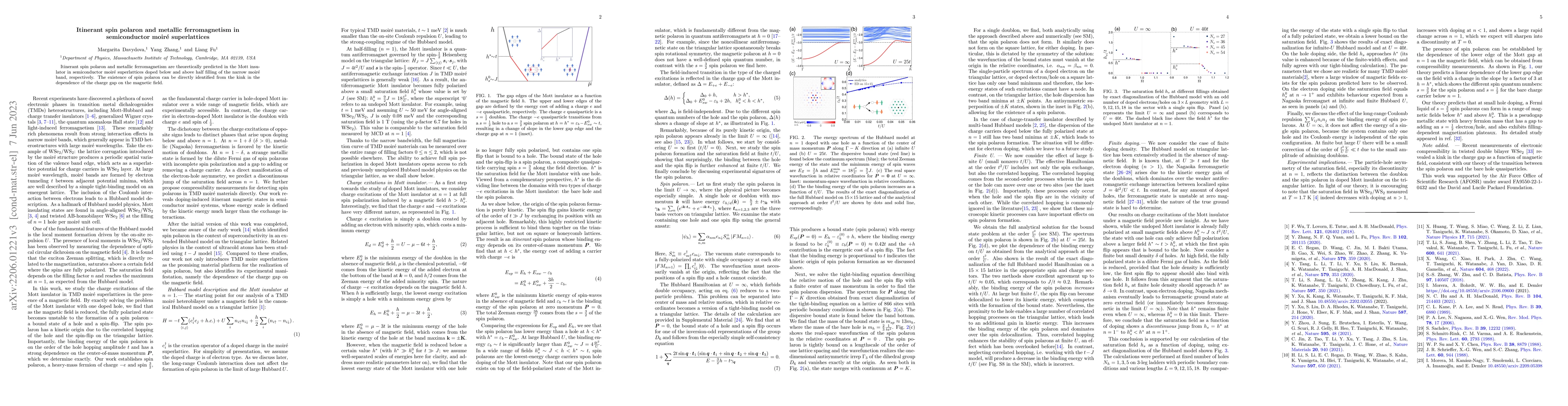 Summary: This paper theoretically predicts itinerant spin polarons and metallic ferromagnetism in doped semiconductor moiré superlattices below and above half filling, respectively, with evidence of spin polarons identified by a kink in the charge gap-magnetic field relationship.