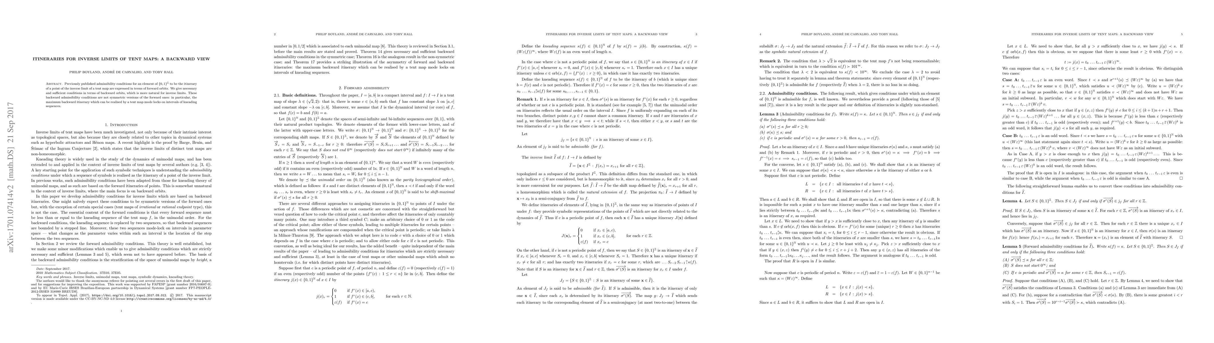 Previously published admissibility conditions for an element of $\{0,1\}^{\mathbb{Z}}$ to be the itinerary of a point of the inverse limit of a tent map are expressed in terms of forward orbits. We give necessary and sufficient conditions in terms of backward orbits, which is more natural for inverse limits. These backward admissibility conditions are not symmetric versions of the forward ones: in particular, the maximum backward itinerary which can be realised by a tent map mode locks on intervals of kneading sequences.