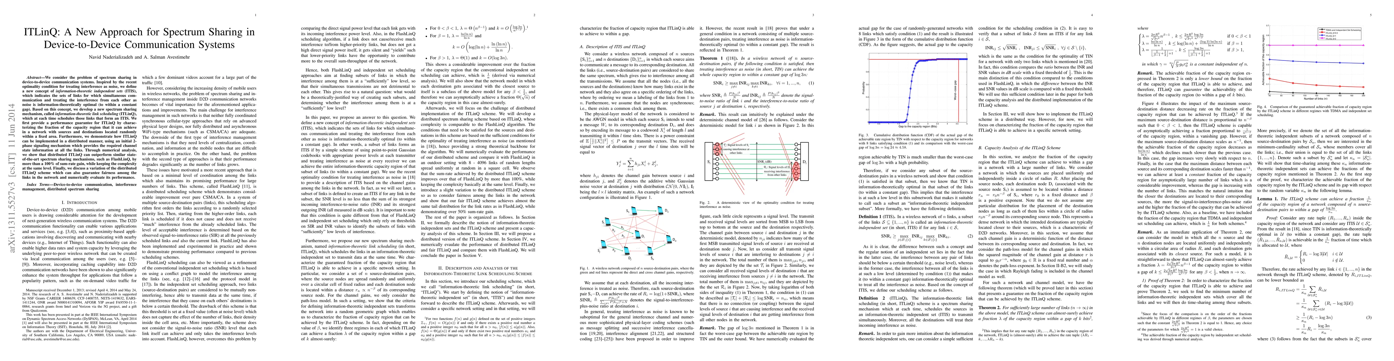 We consider the problem of spectrum sharing in device-to-device communication systems. Inspired by the recent optimality condition for treating interference as noise, we define a new concept of "information-theoretic independent sets" (ITIS), which indicates the sets of links for which simultaneous communication and treating the interference from each other as noise is information-theoretically optimal (to within a constant gap). Based on this concept, we develop a new spectrum sharing mechanism, called "information-theoretic link scheduling" (ITLinQ), which at each time schedules those links that form an ITIS. We first provide a performance guarantee for ITLinQ by characterizing the fraction of the capacity region that it can achieve in a network with sources and destinations located randomly within a fixed area. Furthermore, we demonstrate how ITLinQ can be implemented in a distributed manner, using an initial 2-phase signaling mechanism which provides the required channel state information at all the links. Through numerical analysis, we show that distributed ITLinQ can outperform similar state-of-the-art spectrum sharing mechanisms, such as FlashLinQ, by more than a 100% of sum-rate gain, while keeping the complexity at the same level. Finally, we discuss a variation of the distributed ITLinQ scheme which can also guarantee fairness among the links in the network and numerically evaluate its performance.