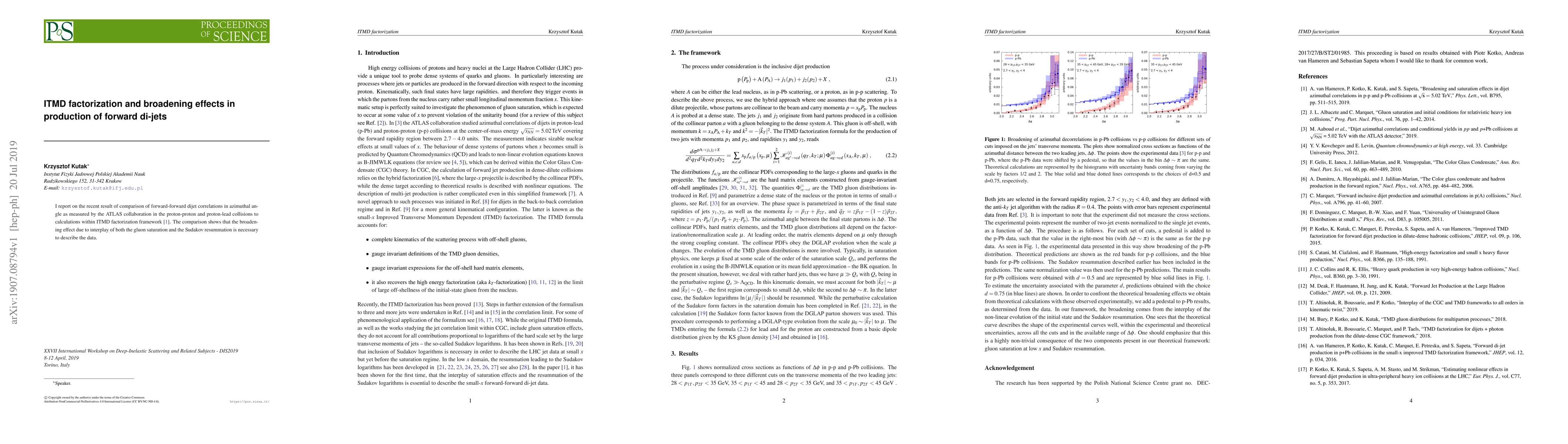 I report on the recent result of comparison of forward-forward dijet correlations in azimuthal angle as measured by the ATLAS collaboration in the proton-proton and proton-lead collisions to calculations within ITMD factorization framework [1]. The comparison shows that the broadening effect due to interplay of both the gluon saturation and the Sudakov resummation is necessary to describe the data.