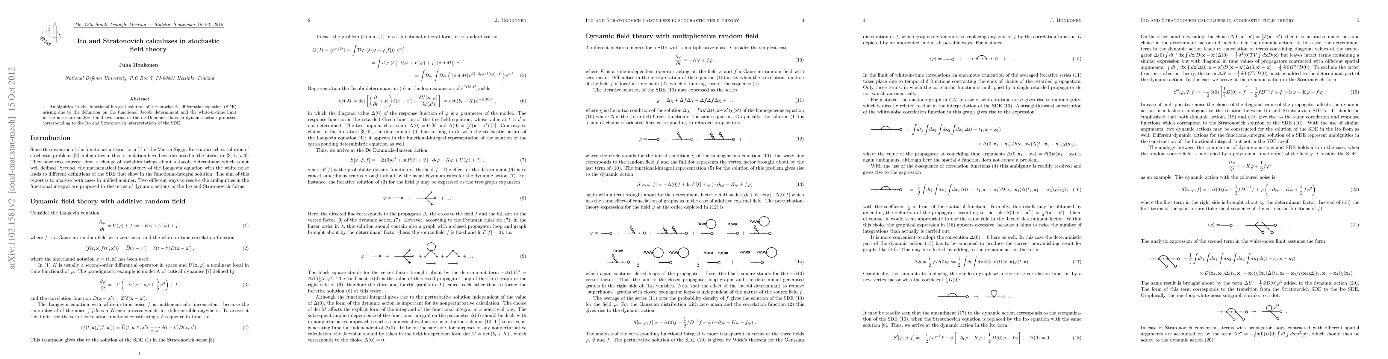 Ambiguities in the functional-integral solution of the stochastic differential equation (SDE) arising due to the definition on the functional Jacobi determinant and the white-in-time limit in the noise are analyzed and two forms of the de Dominicis-Janssen dynamic action proposed corresponding to the Ito and Stratonovich interpretations of the SDE.