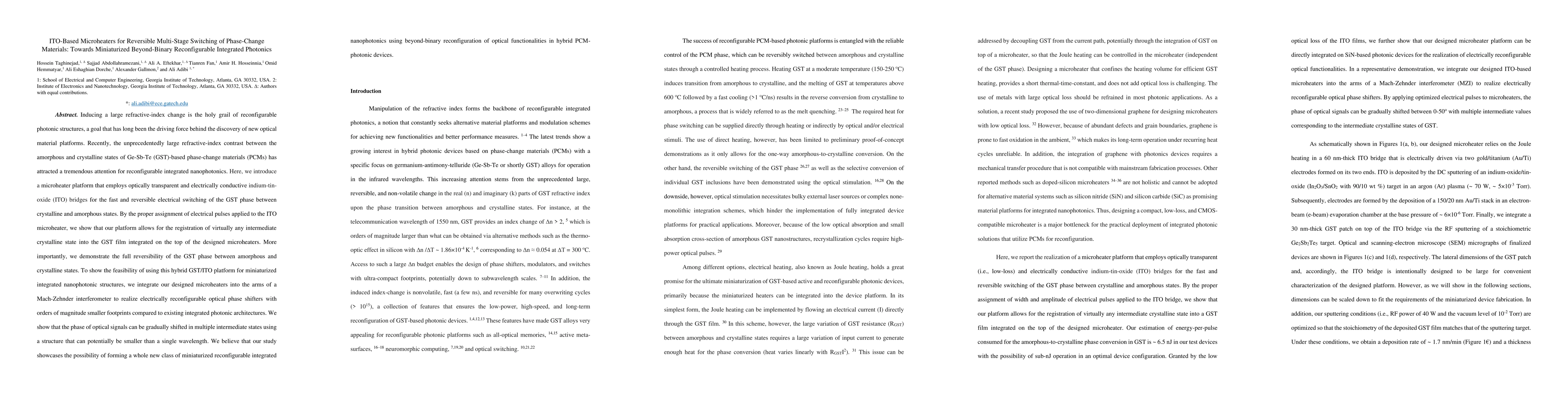 This paper introduces ITO-based microheaters for reversible multi-stage switching of Ge-Sb-Te (GST) phase-change materials, enabling beyond-binary reconfigurable optical phase shifters in integrated photonics. The proposed platform demonstrates full reversibility and miniaturization, showing potential for next-generation nanophotonic devices.