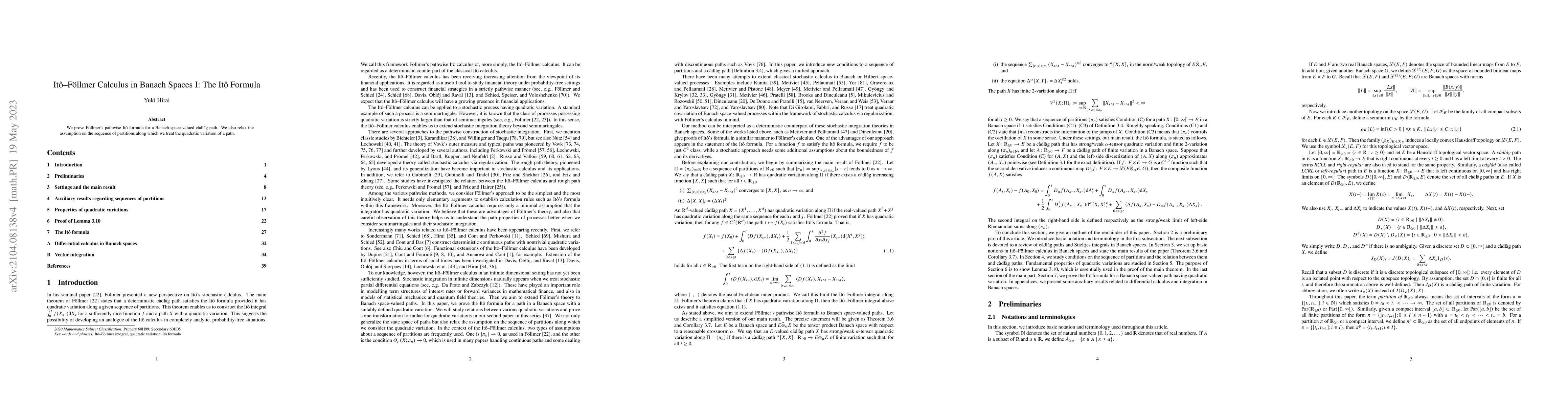 Summary: This paper proves Föllmer's Itô formula for Banach space-valued càdlàg paths, and relaxes the assumptions on the sequence of partitions used for the quadratic variation of a path.