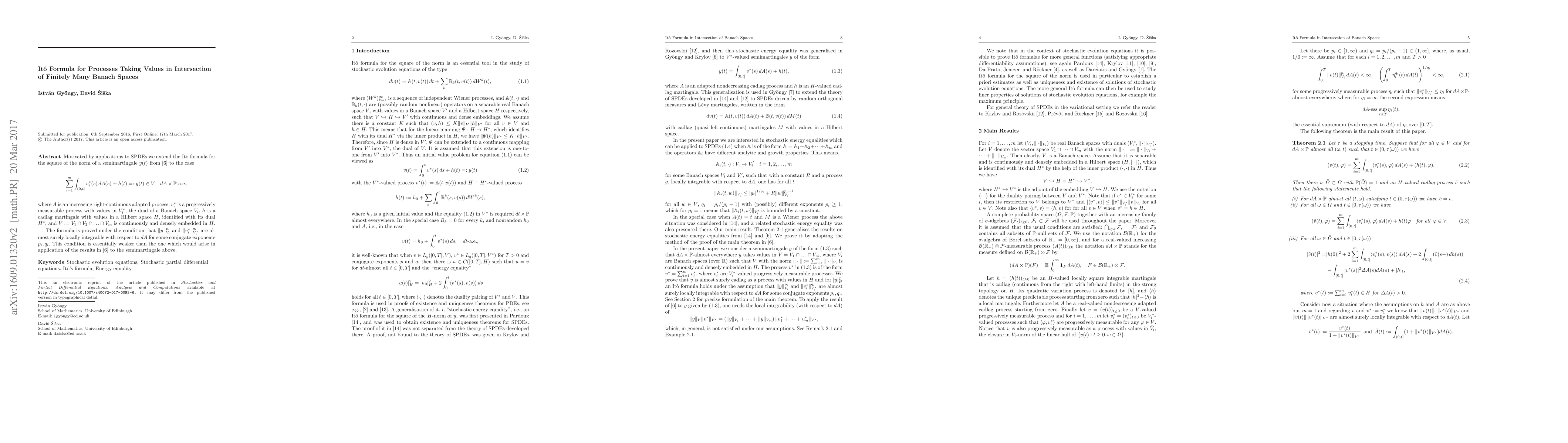 Motivated by applications to SPDEs we extend the It\^o formula for the square of the norm of a semimartingale $y(t)$ from Gy\"ongy and Krylov (Stochastics 6(3):153-173, 1982) to the case \begin{equation*} \sum_{i=1}^m \int_{(0,t]} v_i^{\ast}(s)\,dA(s) + h(t)=:y(t)\in V \quad \text{$dA\times \mathbb{P}$-a.e.}, \end{equation*} where $A$ is an increasing right-continuous adapted process, $v_i^{\ast}$ is a progressively measurable process with values in $V_i^{\ast}$, the dual of a Banach space $V_i$, $h$ is a cadlag martingale with values in a Hilbert space $H$, identified with its dual $H^{\ast}$, and $V:=V_1\cap V_2 \cap \ldots \cap V_m$ is continuously and densely embedded in $H$. The formula is proved under the condition that $\|y\|_{V_i}^{p_i}$ and $\|v_i^\ast\|_{V_i^\ast}^{q_i}$ are almost surely locally integrable with respect to $dA$ for some conjugate exponents $p_i, q_i$. This condition is essentially weaker than the one which would arise in application of the results in Gy\"ongy and Krylov (Stochastics 6(3):153-173, 1982) to the semimartingale above.
