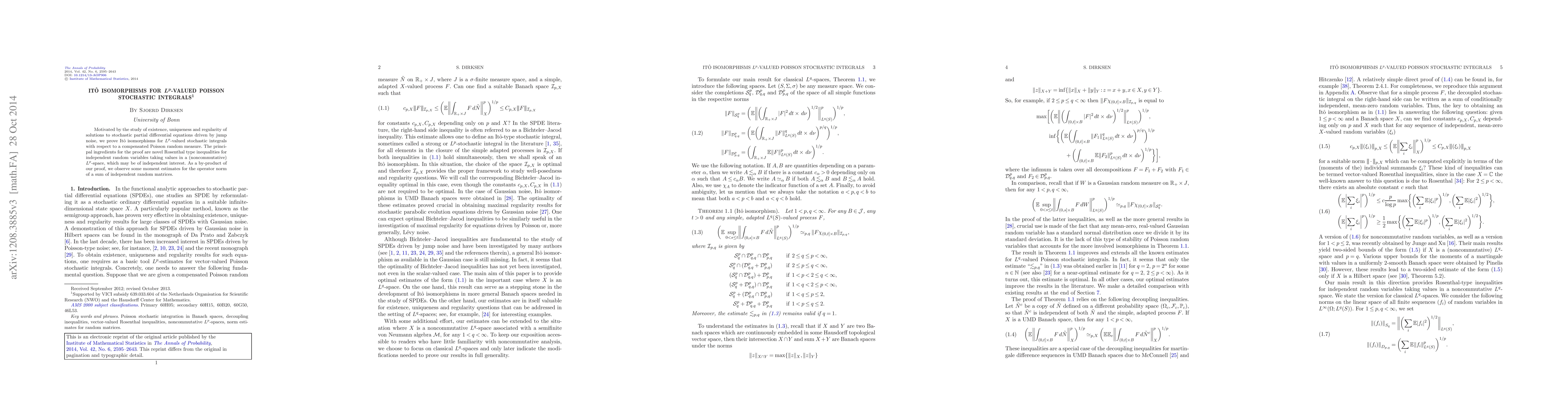 This paper proves Itô isomorphisms for $L^p$-valued Poisson stochastic integrals, driven by a compensated Poisson random measure, to aid in understanding stochastic partial differential equations with jump noise. The proof leverages new Rosenthal type inequalities for independent random variables in $L^p$-spaces, with additional moment estimates for the operator norm of sums of independent random matrices as a by-product.