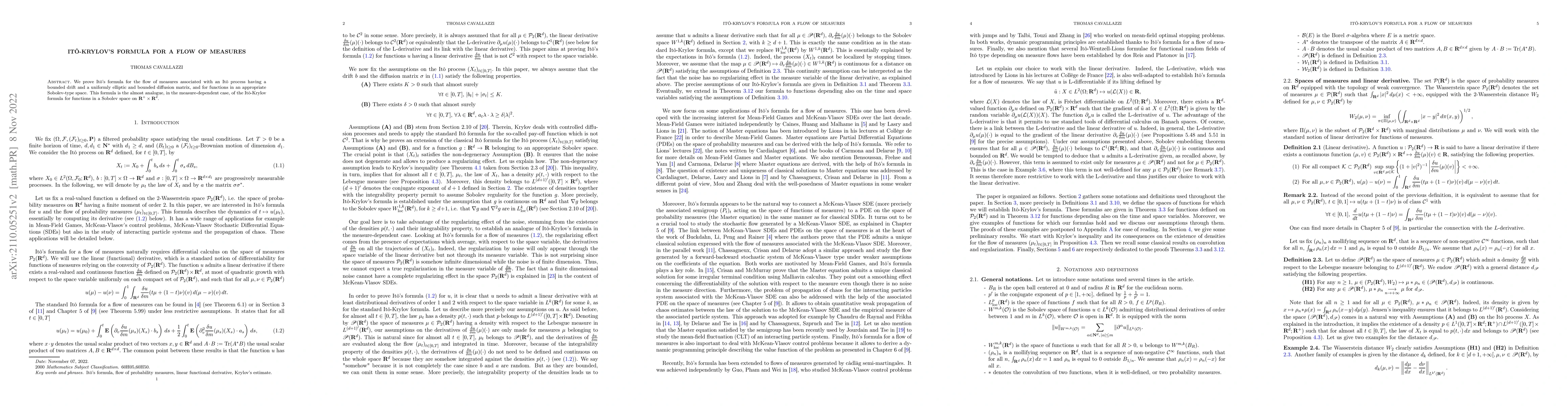 Summary: This paper proves Itô's formula for the flow of measures linked to an Itô process with bounded drift and a uniformly elliptic diffusion matrix, extending the Itô-Krylov formula to a measure-dependent setting for functions in a Sobolev-type space.