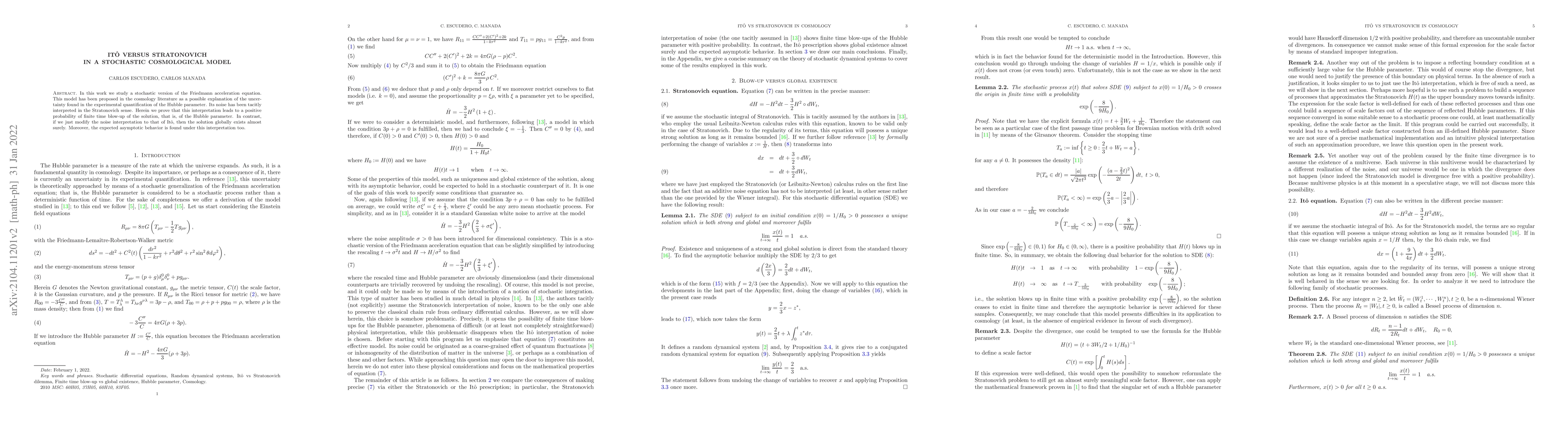 In this work we study a stochastic version of the Friedmann acceleration equation. This model has been proposed in the cosmology literature as a possible explanation of the uncertainty found in the experimental quantification of the Hubble parameter. Its noise has been tacitly interpreted in the Stratonovich sense. Herein we prove that this interpretation leads to a positive probability of finite time blow-up of the solution, that is, of the Hubble parameter. In contrast, if we just modify the noise interpretation to that of It\^o, then the solution globally exists almost surely. Moreover, the expected asymptotic behavior is found under this interpretation too.