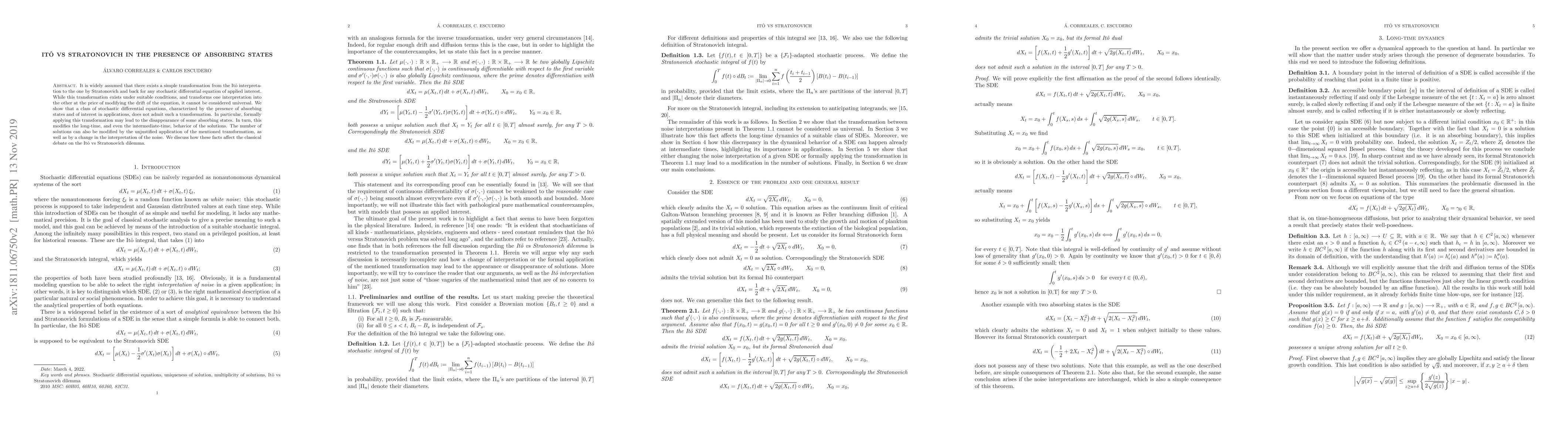 It is widely assumed that there exists a simple transformation from the It\^o interpretation to the one by Stratonovich and back for any stochastic differential equation of applied interest. While this transformation exists under suitable conditions, and transforms one interpretation into the other at the price of modifying the drift of the equation, it cannot be considered universal. We show that a class of stochastic differential equations, characterized by the presence of absorbing states and of interest in applications, does not admit such a transformation. In particular, formally applying this transformation may lead to the disappearance of some absorbing states. In turn, this modifies the long-time, and even the intermediate-time, behavior of the solutions. The number of solutions can also be modified by the unjustified application of the mentioned transformation, as well as by a change in the interpretation of the noise. We discuss how these facts affect the classical debate on the It\^o vs Stratonovich dilemma.