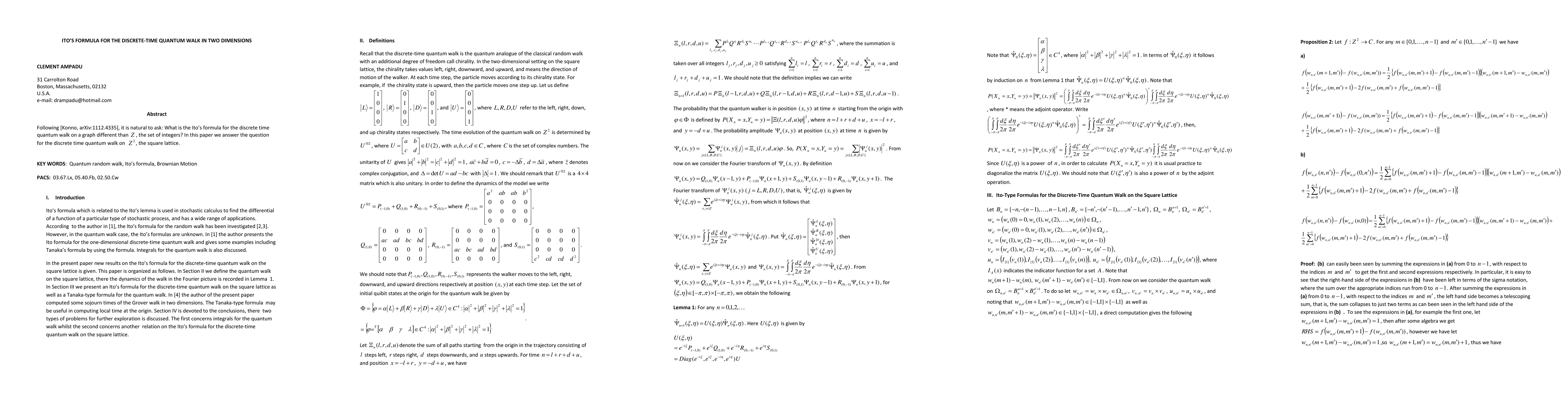 This paper derives Ito's formula for the discrete-time quantum walk on the two-dimensional square lattice \(Z^2\), extending the results from integer lattices to more complex graph structures. The findings provide a mathematical framework for understanding the stochastic behavior of quantum walks in higher dimensions.