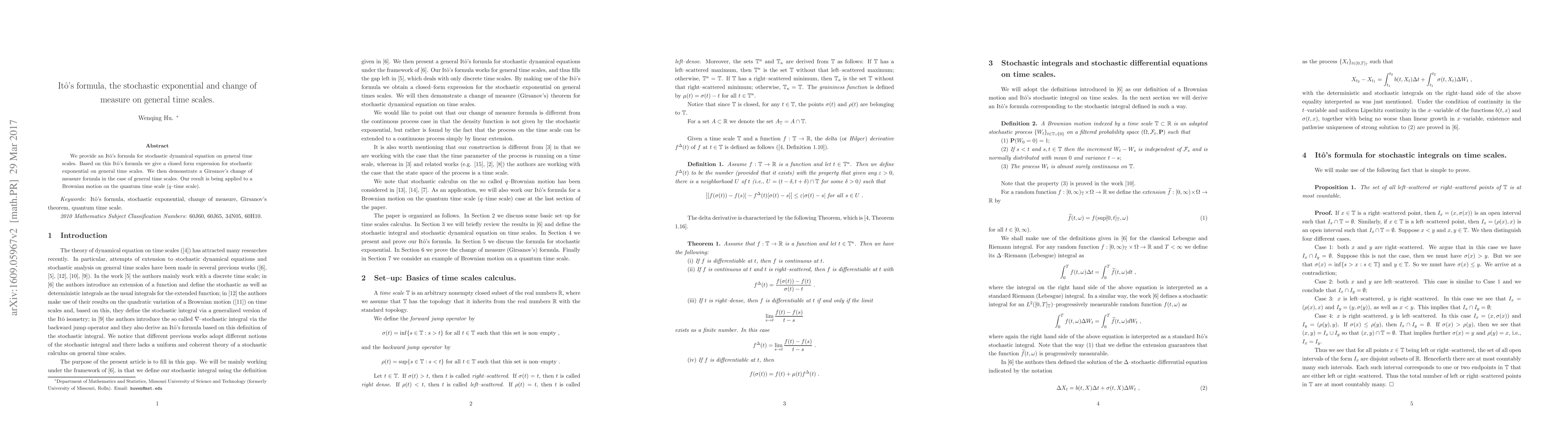 We provide an It\^{o}'s formula for stochastic dynamical equation on general time scales. Based on this It\^{o}'s formula we give a closed form expression for stochastic exponential on general time scales. We then demonstrate a Girsanov's change of measure formula in the case of general time scales. Our result is being applied to a Brownian motion on the quantum time scale (q-time scale).