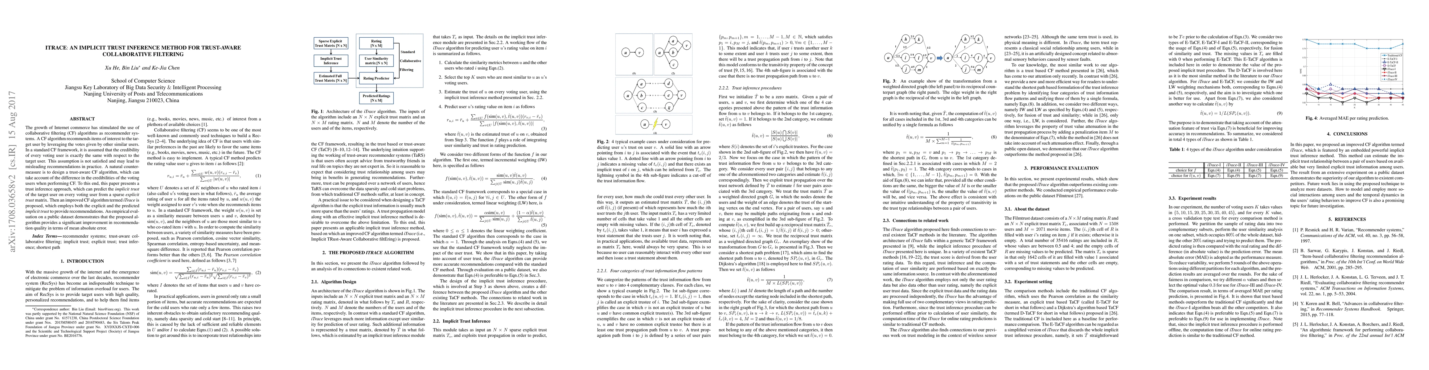 The growth of Internet commerce has stimulated the use of collaborative filtering (CF) algorithms as recommender systems. A collaborative filtering (CF) algorithm recommends items of interest to the target user by leveraging the votes given by other similar users. In a standard CF framework, it is assumed that the credibility of every voting user is exactly the same with respect to the target user. This assumption is not satisfied and thus may lead to misleading recommendations in many practical applications. A natural countermeasure is to design a trust-aware CF (TaCF) algorithm, which can take account of the difference in the credibilities of the voting users when performing CF. To this end, this paper presents a trust inference approach, which can predict the implicit trust of the target user on every voting user from a sparse explicit trust matrix. Then an improved CF algorithm termed iTrace is proposed, which takes advantage of both the explicit and the predicted implicit trust to provide recommendations with the CF framework. An empirical evaluation on a public dataset demonstrates that the proposed algorithm provides a significant improvement in recommendation quality in terms of mean absolute error (MAE).
