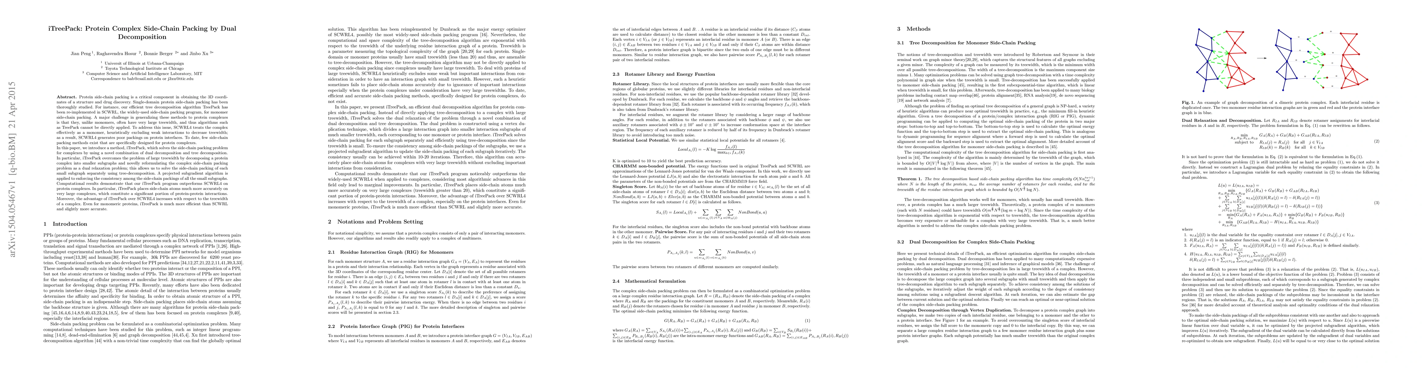 iTreePack introduces a novel method for protein complex side-chain packing using dual decomposition and tree decomposition, outperforming SCWRL4 by more accurately placing side-chain atoms, especially on large complexes, and demonstrating increased efficiency and slight accuracy improvements for monomeric proteins.
