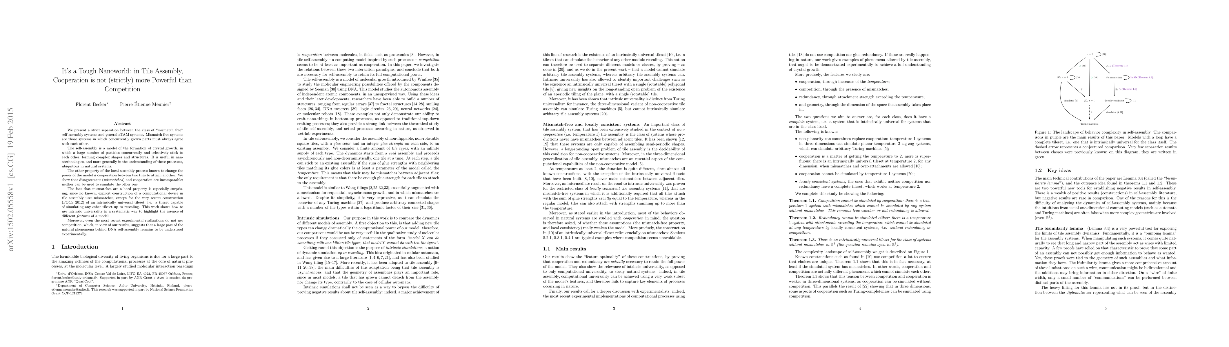 We present a strict separation between the class of "mismatch free" self-assembly systems and general aTAM systems. Mismatch free systems are those systems in which concurrently grown parts must always agree with each other. Tile self-assembly is a model of the formation of crystal growth, in which a large number of particles concurrently and selectively stick to each other, forming complex shapes and structures. It is useful in nanotechnologies, and more generally in the understanding of these processes, ubiquitous in natural systems. The other property of the local assembly process known to change the power of the model is cooperation between two tiles to attach another. We show that disagreement (mismatches) and cooperation are incomparable: neither can be used to simulate the other one. The fact that mismatches are a hard property is especially surprising, since no known, explicit construction of a computational device in tile assembly uses mismatches, except for the recent construction of an intrinsically universal tileset, i.e. a tileset capable of simulating any other tileset up to rescaling. This work shows how to use intrinsic universality in a systematic way to highlight the essence of different features of tile assembly. Moreover, even the most recent experimental realizations do not use competition, which, in view of our results, suggests that a large part of the natural phenomena behind DNA self-assembly remains to be understood experimentally.