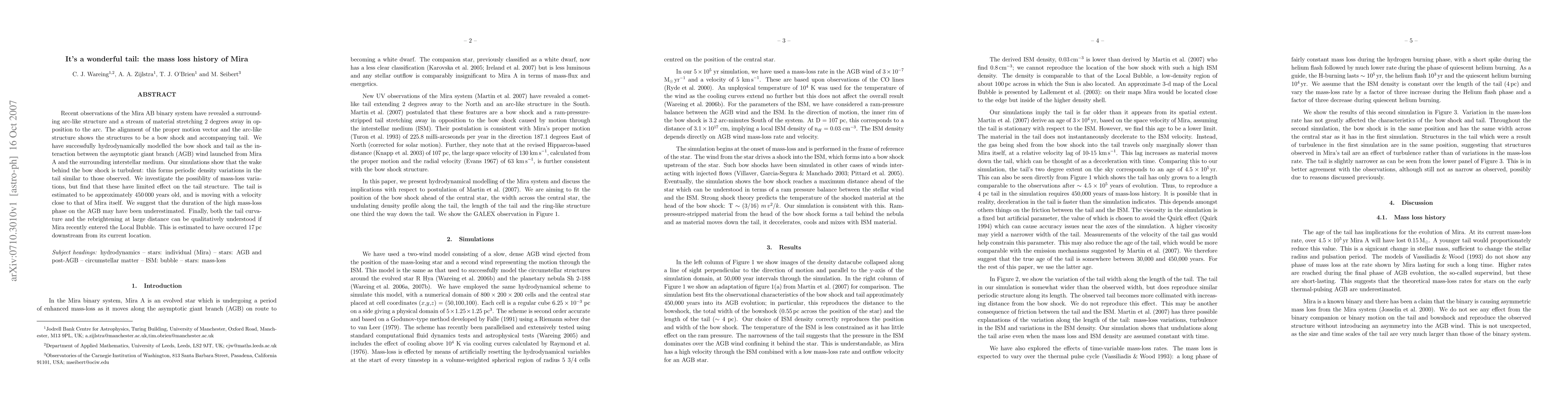 This paper investigates the Mira AB binary system's bow shock and tail, modeling the AGB wind's interaction with the interstellar medium. The tail's turbulence and structure suggest an underestimated high mass-loss phase on the AGB, with the tail estimated to be around 450,000 years old.