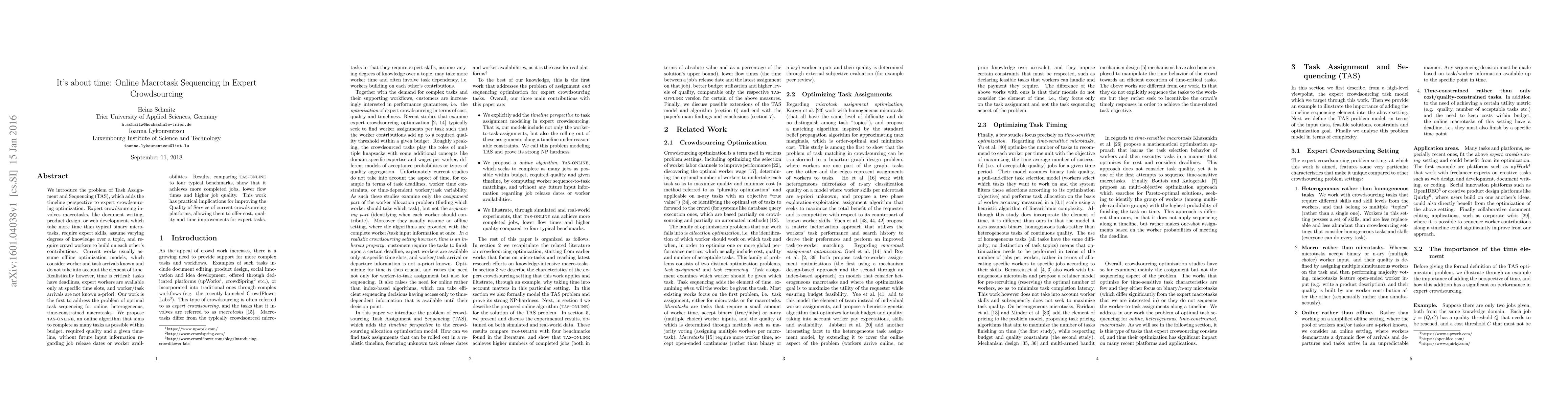 We introduce the problem of Task Assignment and Sequencing (TAS), which adds the timeline perspective to expert crowdsourcing optimization. Expert crowdsourcing involves macrotasks, like document writing, product design, or web development, which take more time than typical binary microtasks, require expert skills, assume varying degrees of knowledge over a topic, and require crowd workers to build on each other's contributions. Current works usually assume offline optimization models, which consider worker and task arrivals known and do not take into account the element of time. Realistically however, time is critical: tasks have deadlines, expert workers are available only at specific time slots, and worker/task arrivals are not known a-priori. Our work is the first to address the problem of optimal task sequencing for online, heterogeneous, time-constrained macrotasks. We propose tas-online, an online algorithm that aims to complete as many tasks as possible within budget, required quality and a given timeline, without future input information regarding job release dates or worker availabilities. Results, comparing tas-online to four typical benchmarks, show that it achieves more completed jobs, lower flow times and higher job quality. This work has practical implications for improving the Quality of Service of current crowdsourcing platforms, allowing them to offer cost, quality and time improvements for expert tasks.