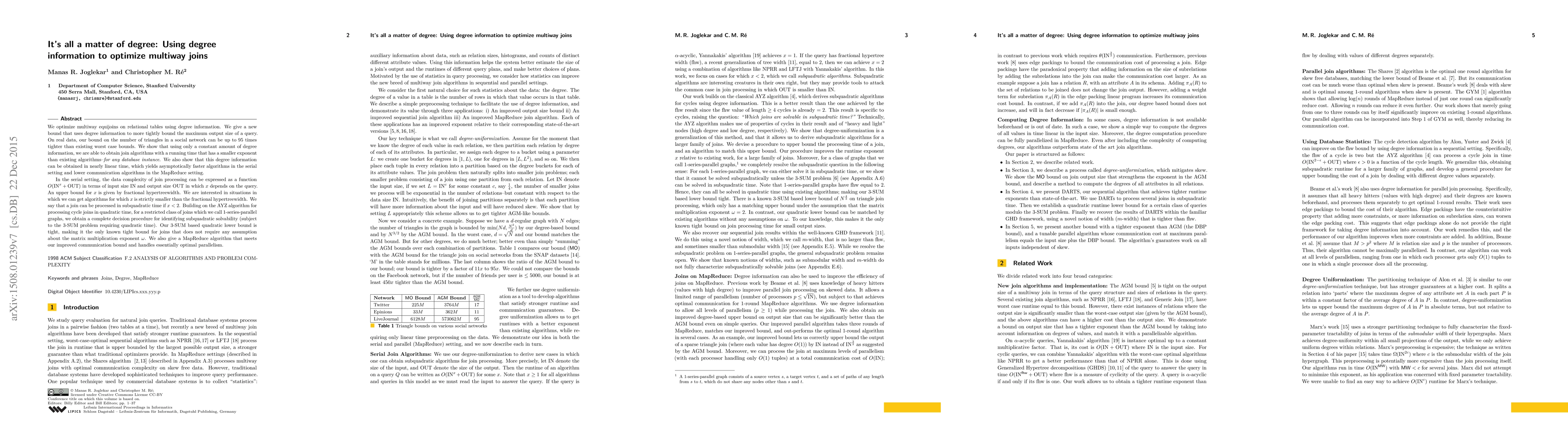 This paper presents a method to optimize multiway equijoins on relational tables using degree information, resulting in tighter bounds on maximum output size and subquadratic time join algorithms. The approach uses degree information to achieve faster join algorithms in both serial and MapReduce settings.