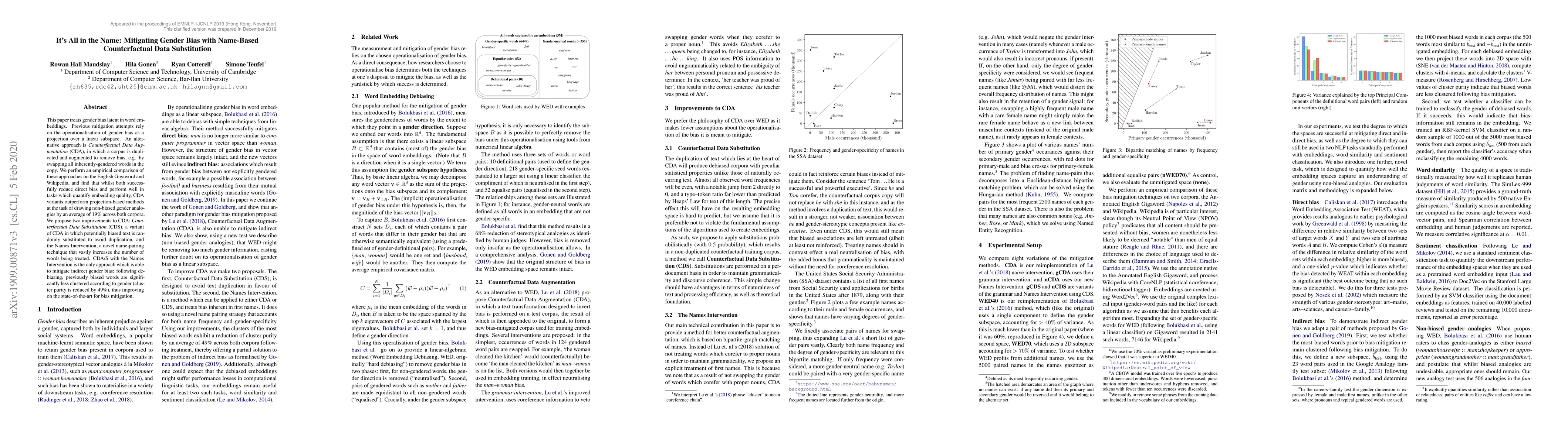 This paper proposes Counterfactual Data Substitution (CDS) to mitigate gender bias in word embeddings, showing that it outperforms traditional projection-based methods in gender analogy tasks. The Names Intervention technique further enhances CDS by significantly reducing indirect gender bias and improving cluster purity.