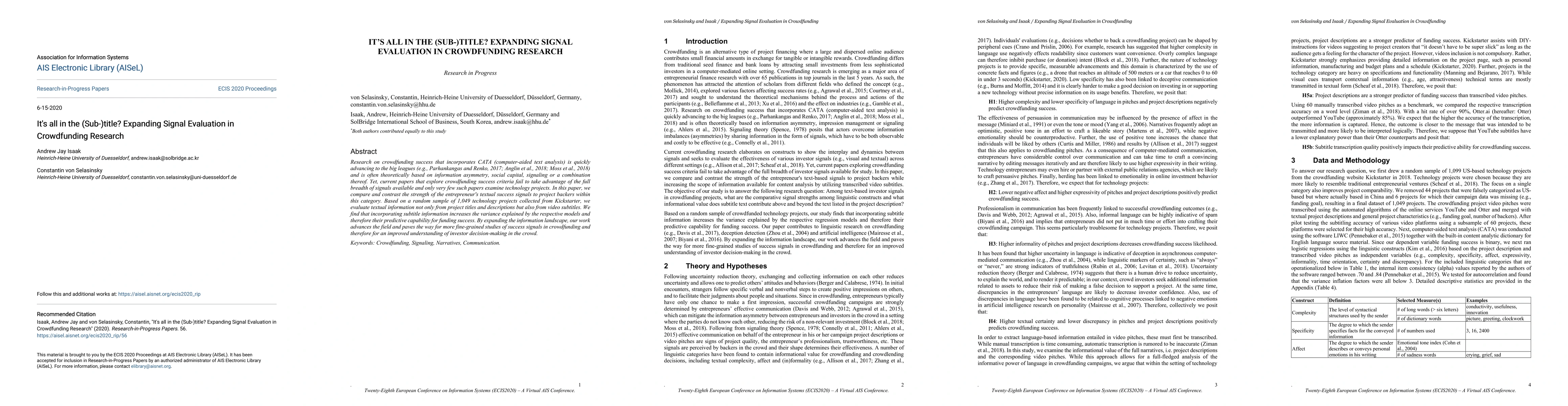 Research on crowdfunding success that incorporates CATA (computer-aided text analysis) is quickly advancing to the big leagues (e.g., Parhankangas and Renko, 2017; Anglin et al., 2018; Moss et al., 2018) and is often theoretically based on information asymmetry, social capital, signaling or a combination thereof. Yet, current papers that explore crowdfunding success criteria fail to take advantage of the full breadth of signals available and only very few such papers examine technology projects. In this paper, we compare and contrast the strength of the entrepreneur's textual success signals to project backers within this category. Based on a random sample of 1,049 technology projects collected from Kickstarter, we evaluate textual information not only from project titles and descriptions but also from video subtitles. We find that incorporating subtitle information increases the variance explained by the respective models and therefore their predictive capability for funding success. By expanding the information landscape, our work advances the field and paves the way for more fine-grained studies of success signals in crowdfunding and therefore for an improved understanding of investor decision-making in the crowd.