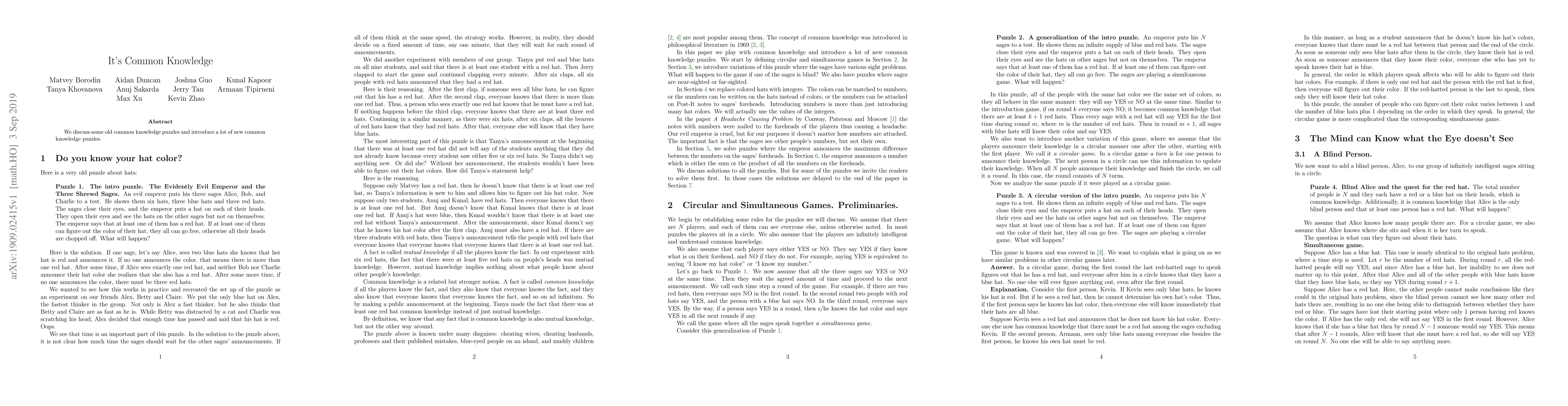 This paper discusses common knowledge puzzles, presenting both new and old problems, with no specific key findings or methodology mentioned.